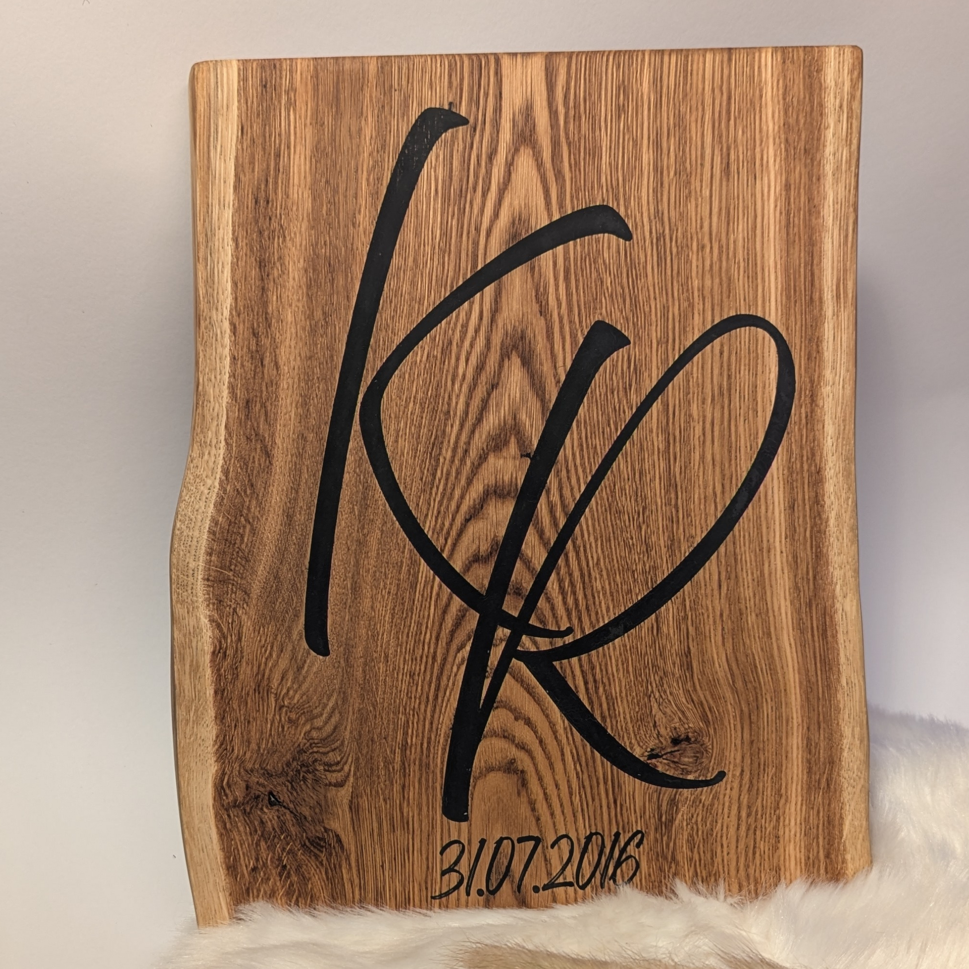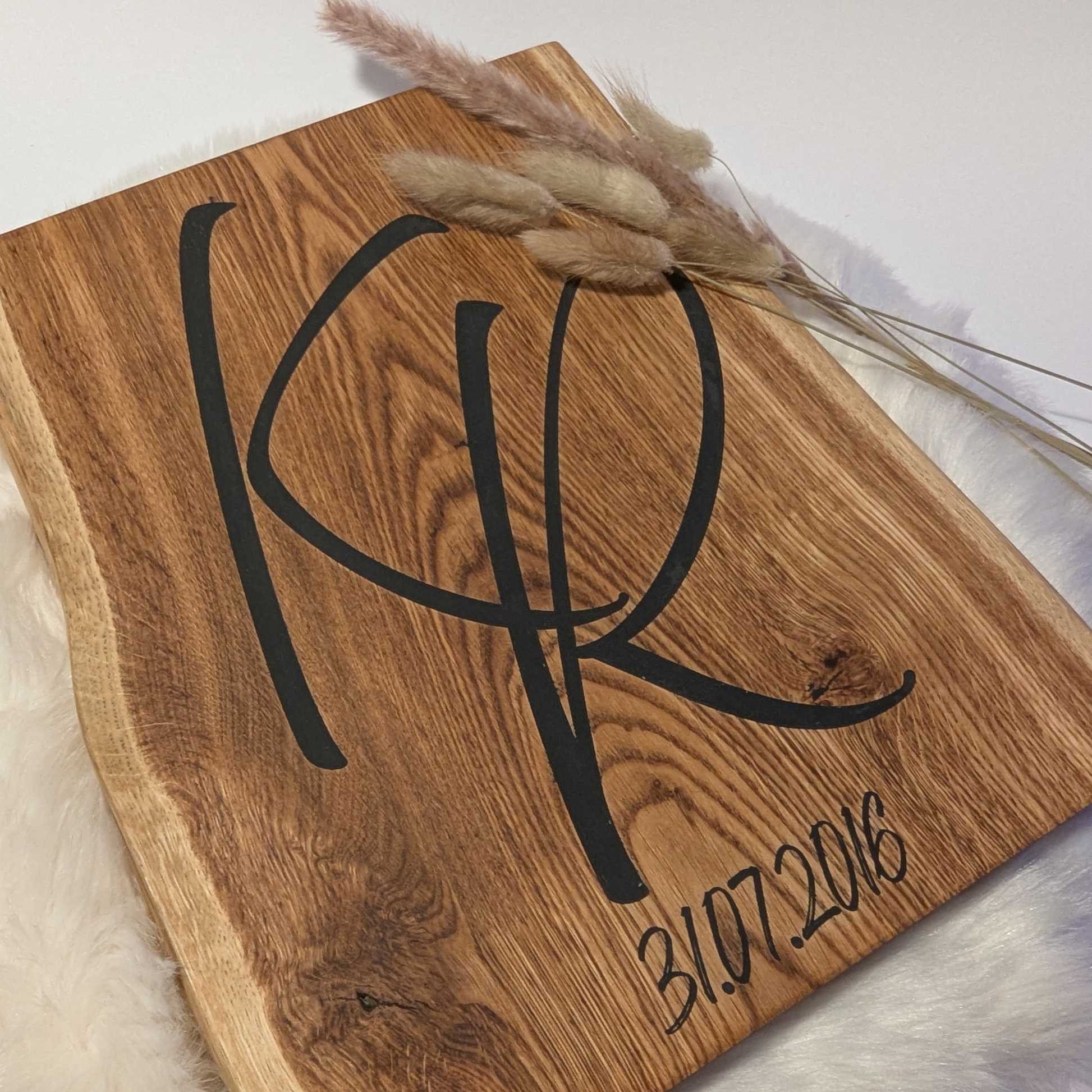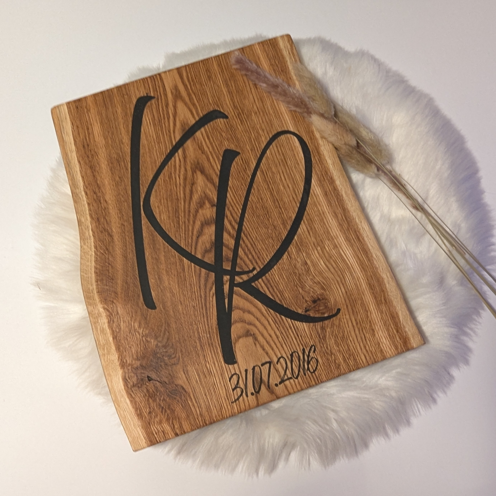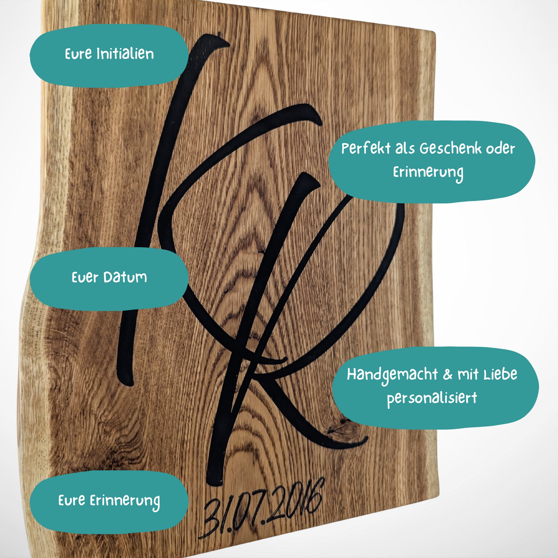 Handgemachtes Eichenholz-Brett individuell mit euren Initialen & Wunschdatum graviert.