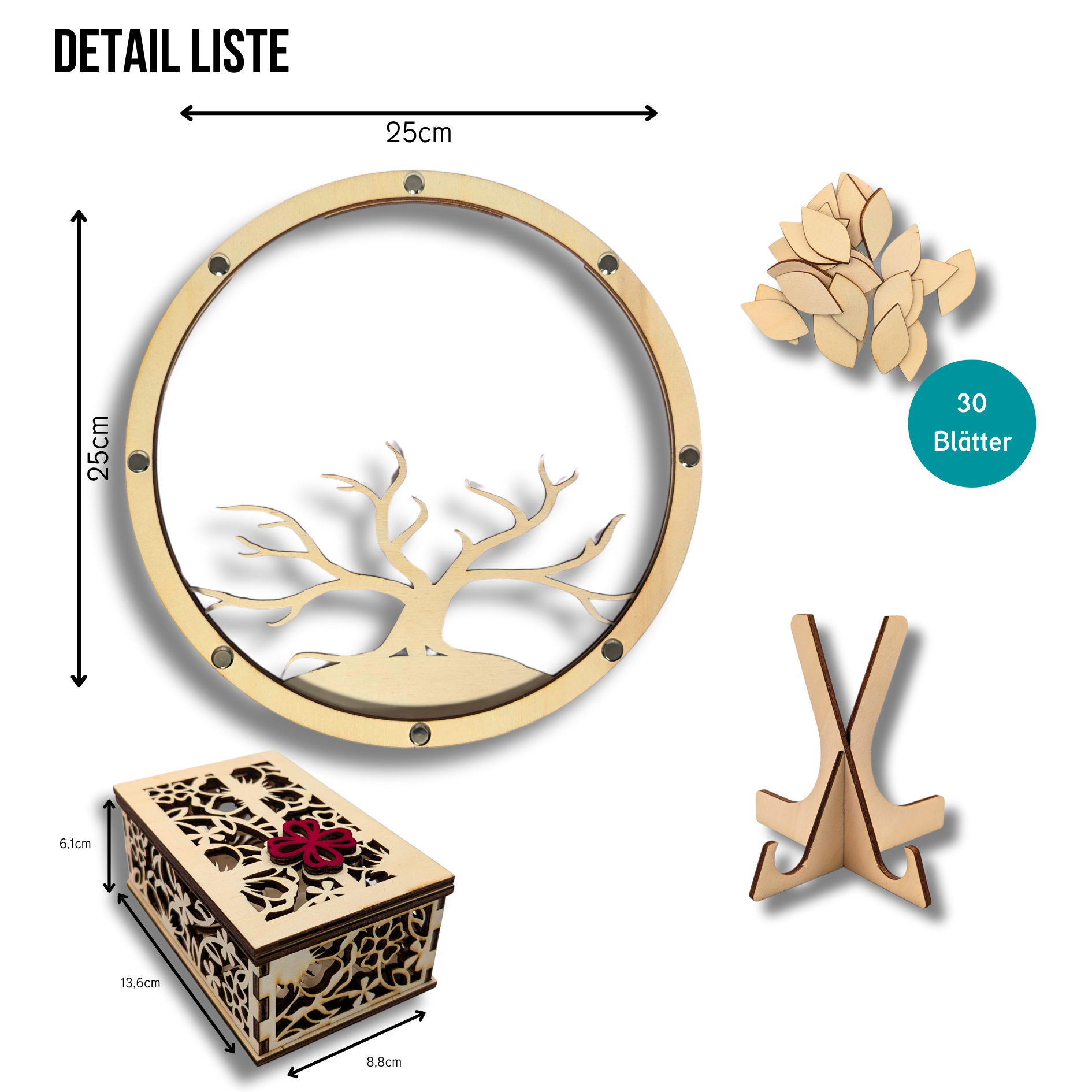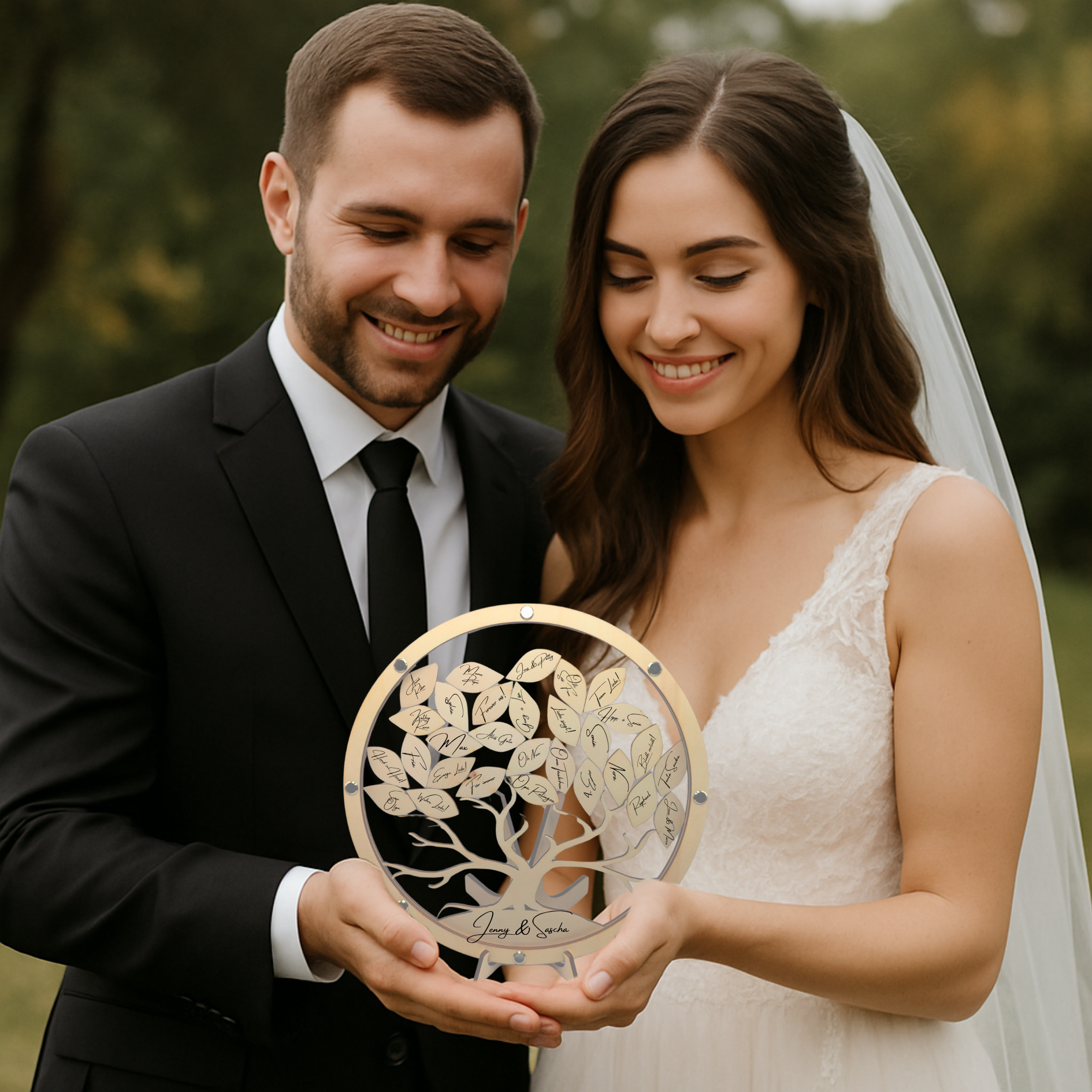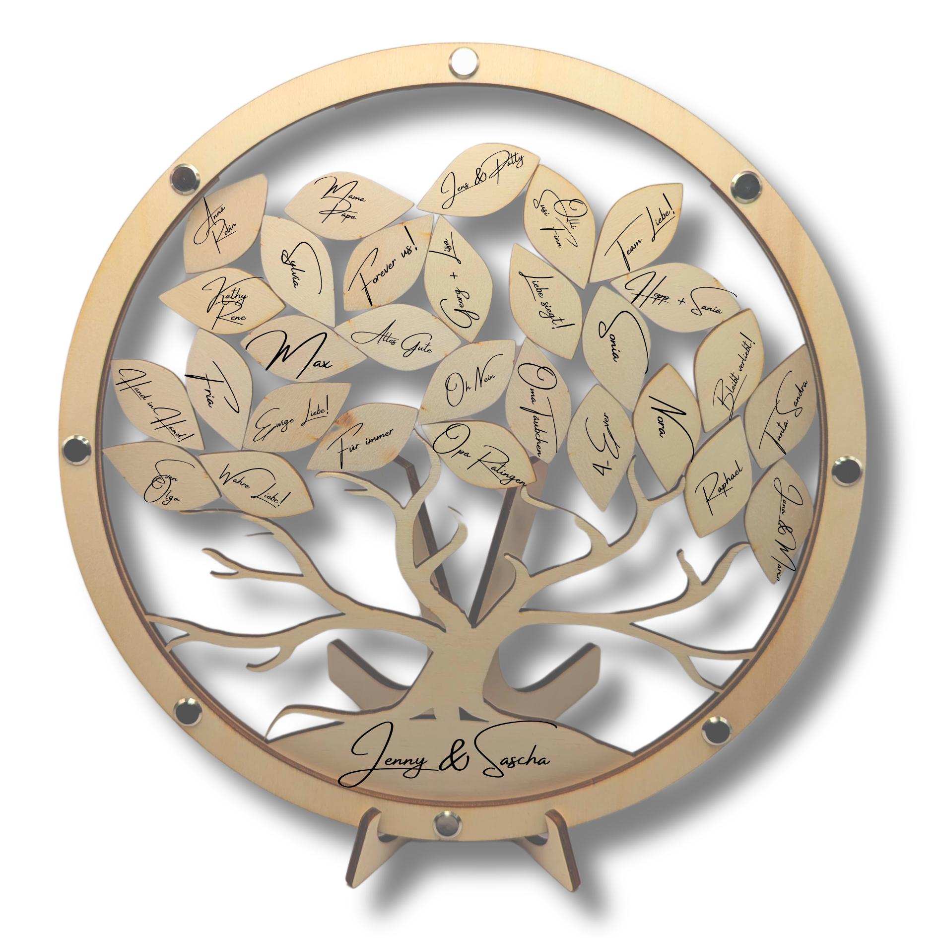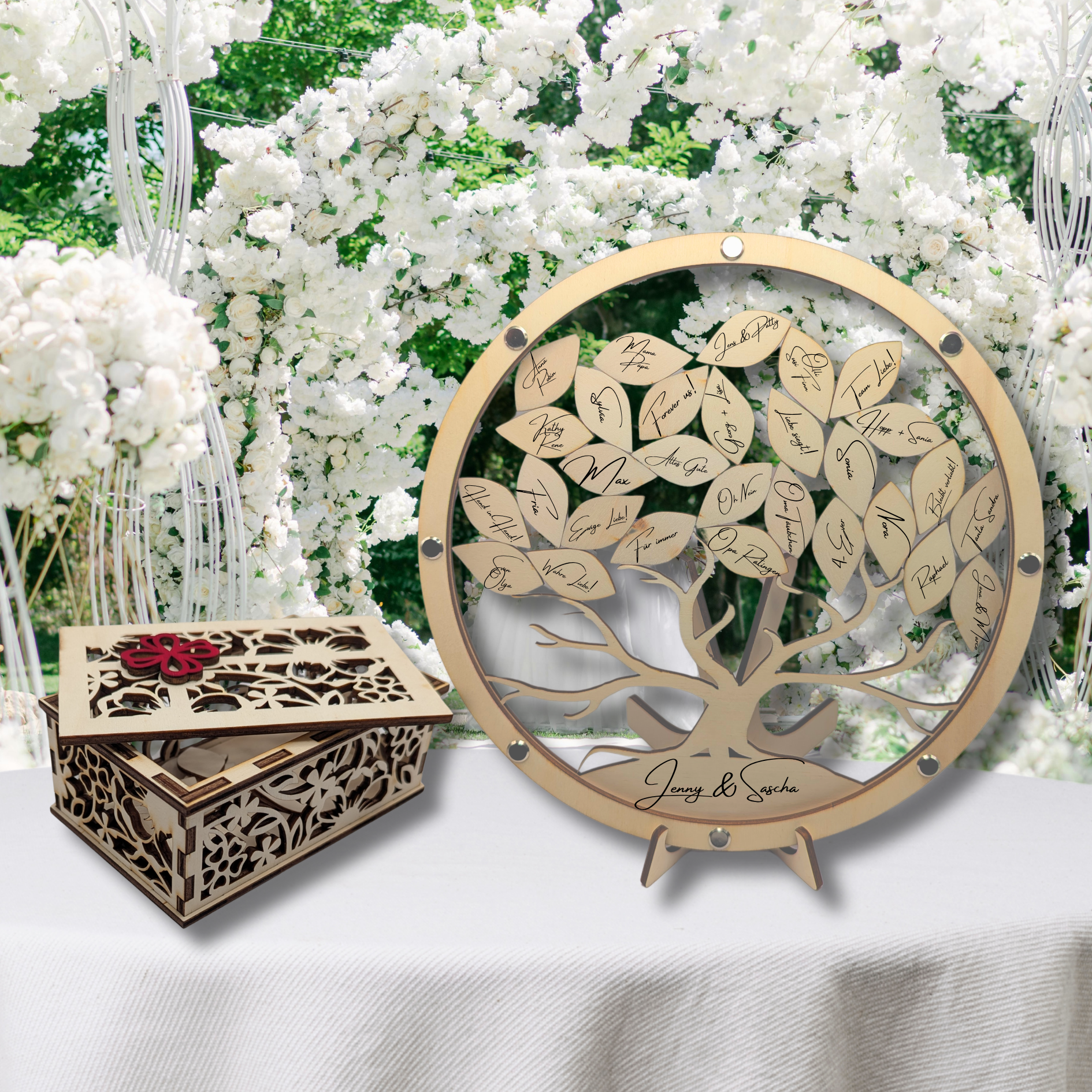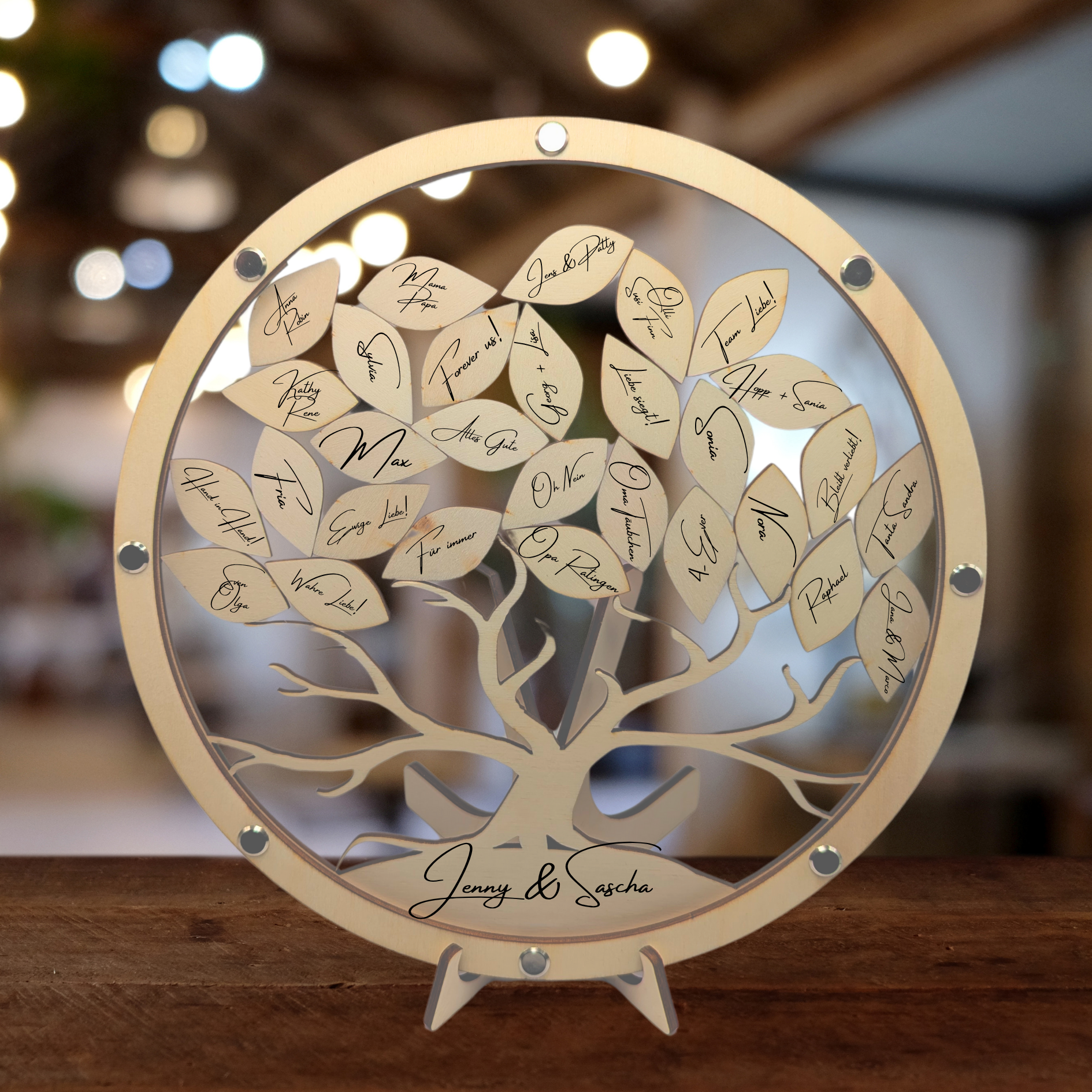 Dieser dekorative Hochzeitsbaum aus hochwertigem Holz ist nicht nur ein Erinnerungsstück, sondern auch eine kreative Alternative zum klassischen Gästebuch. Eure Gäste schreiben ihre Namen oder Wünsche auf kleine Holzblätter und werfen sie oben in den Rahmen ein – einfach, elegant und emotional.