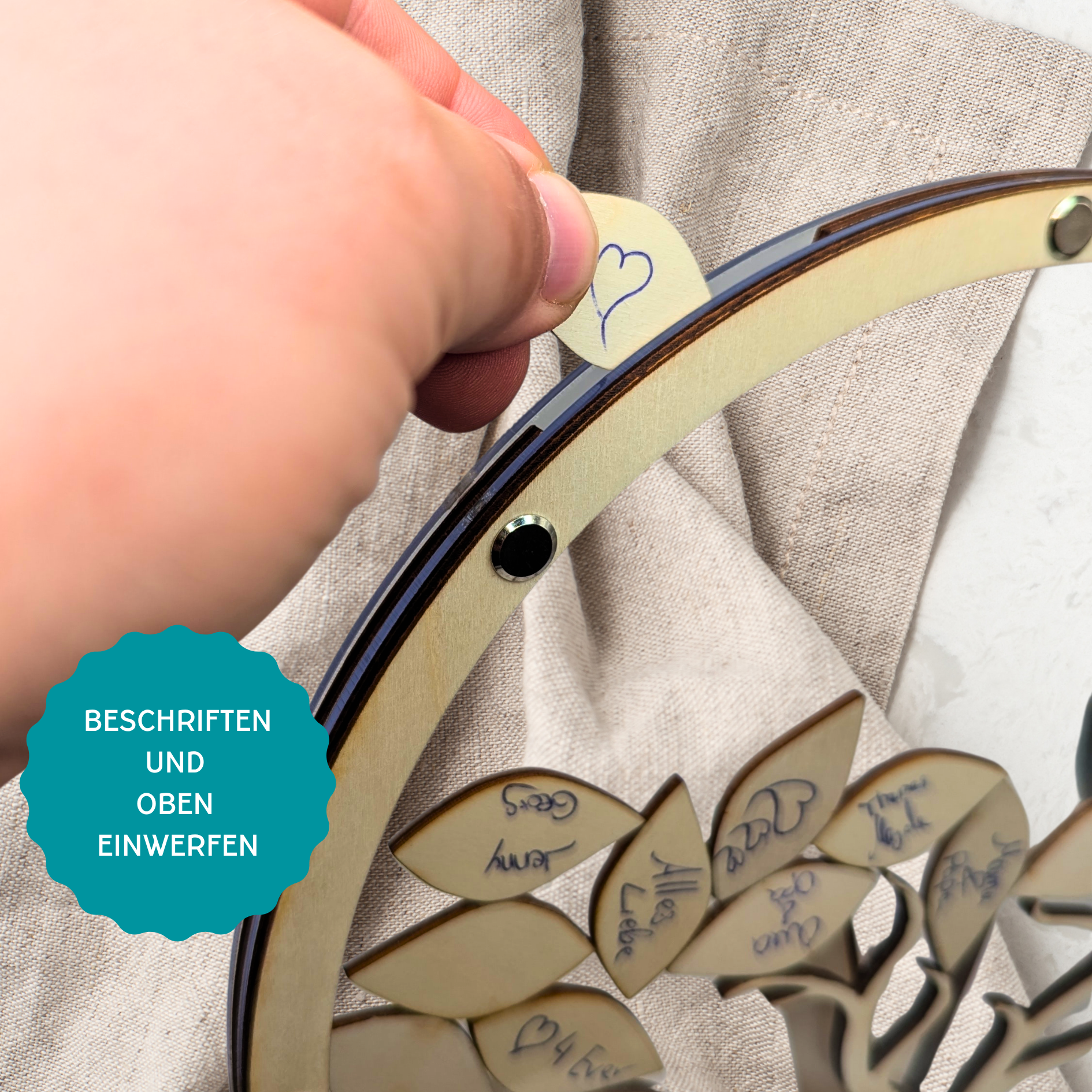 Blatt beschriften, oben einwerfen – fertig! Der Baum füllt sich Blatt für Blatt mit wertvollen Erinnerungen eurer Gäste.