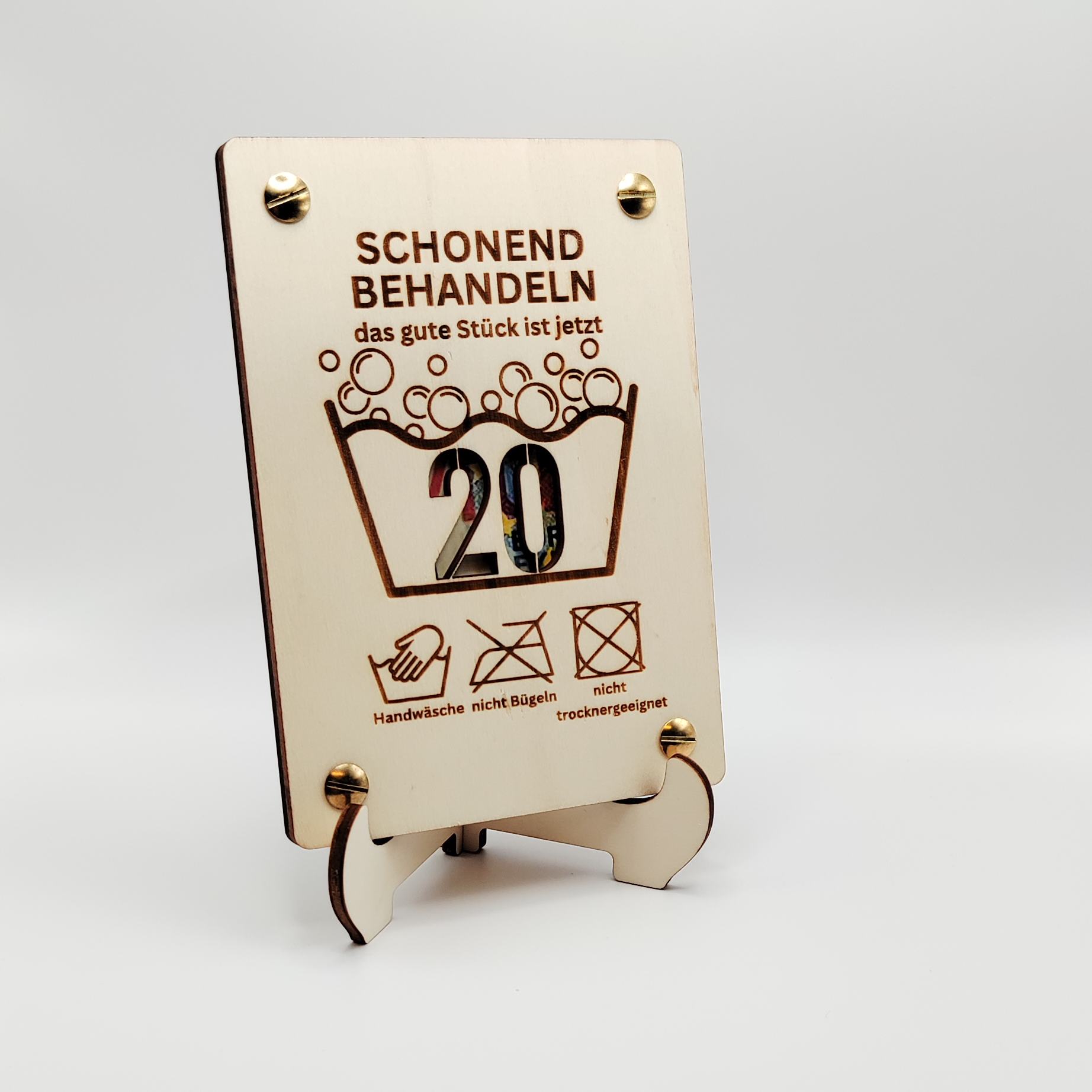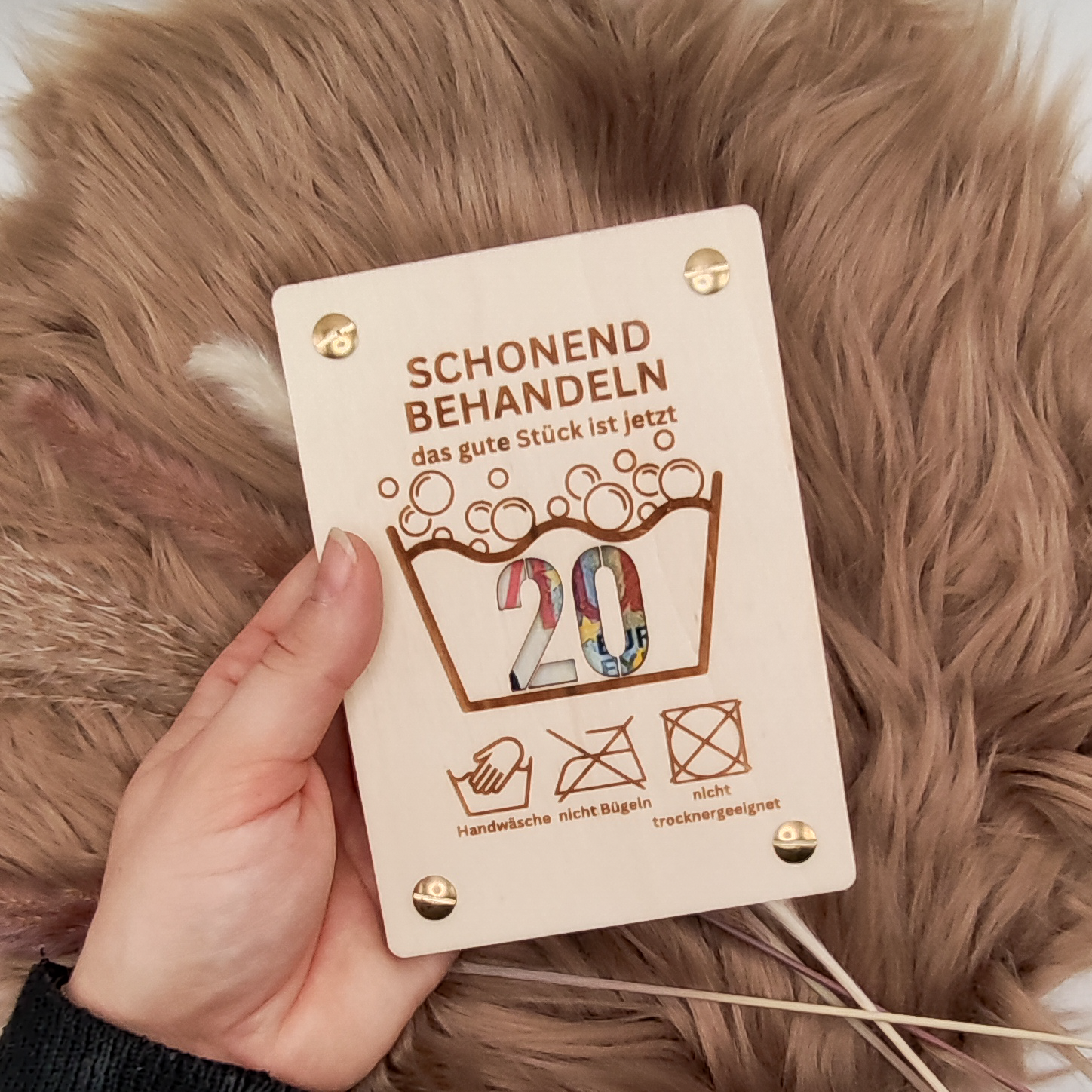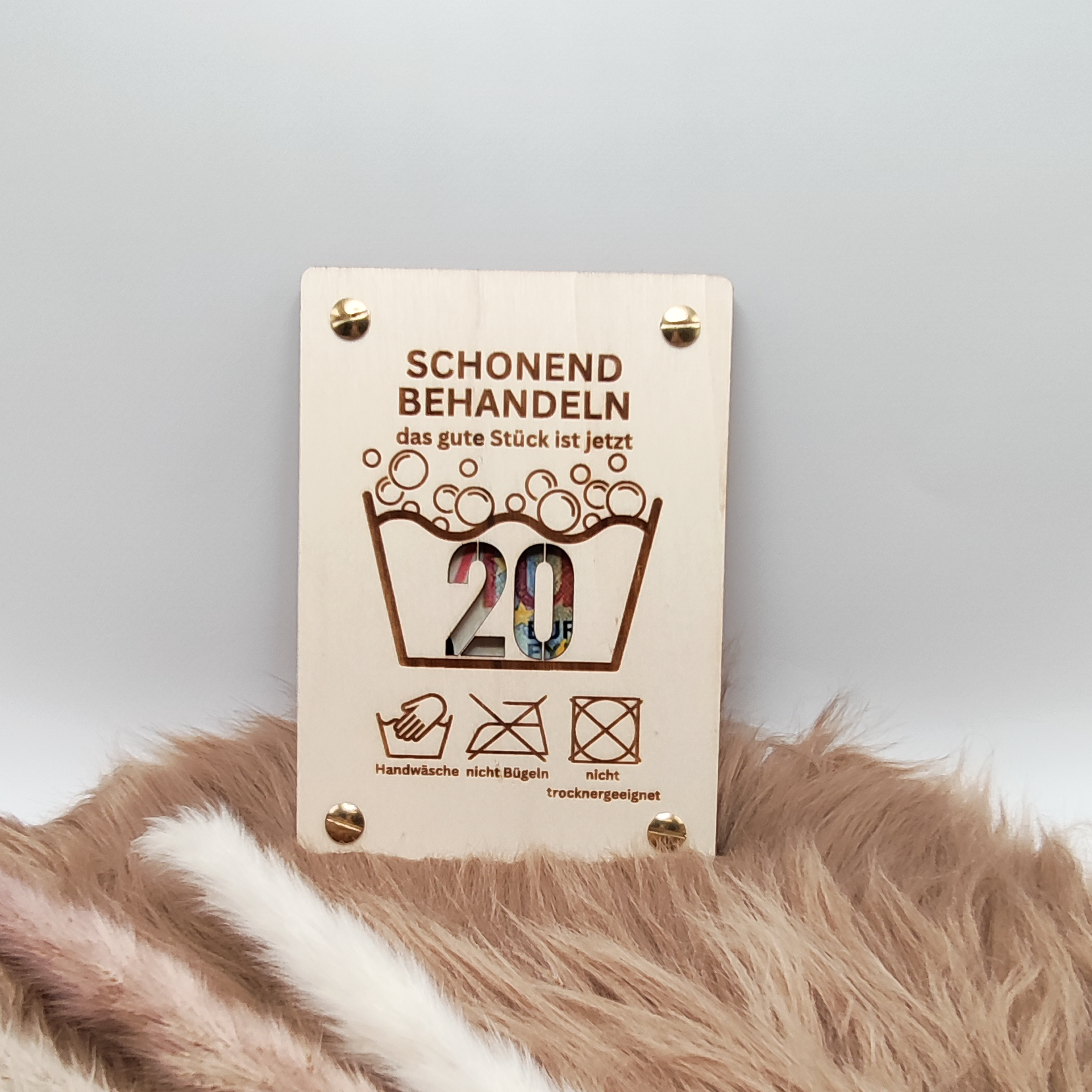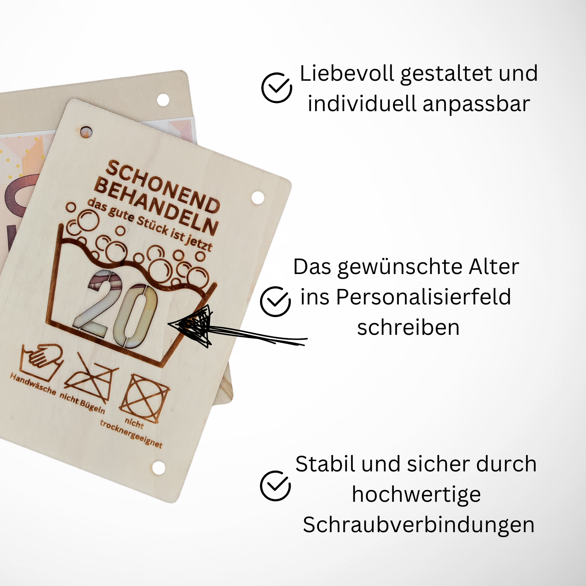 Schenke Humor und ein originelles Geldgeschenk mit dieser witzigen Holzkarte! Perfekt für Geburtstage, bei denen das Alter mit einem Augenzwinkern gefeiert wird. Die Karte ist mit dem humorvollen Spruch "Schonend Behandeln – das gute Stück ist jetzt..." graviert, wobei die Zahl des Alters als kreativer Ausschnitt präsentiert wird.