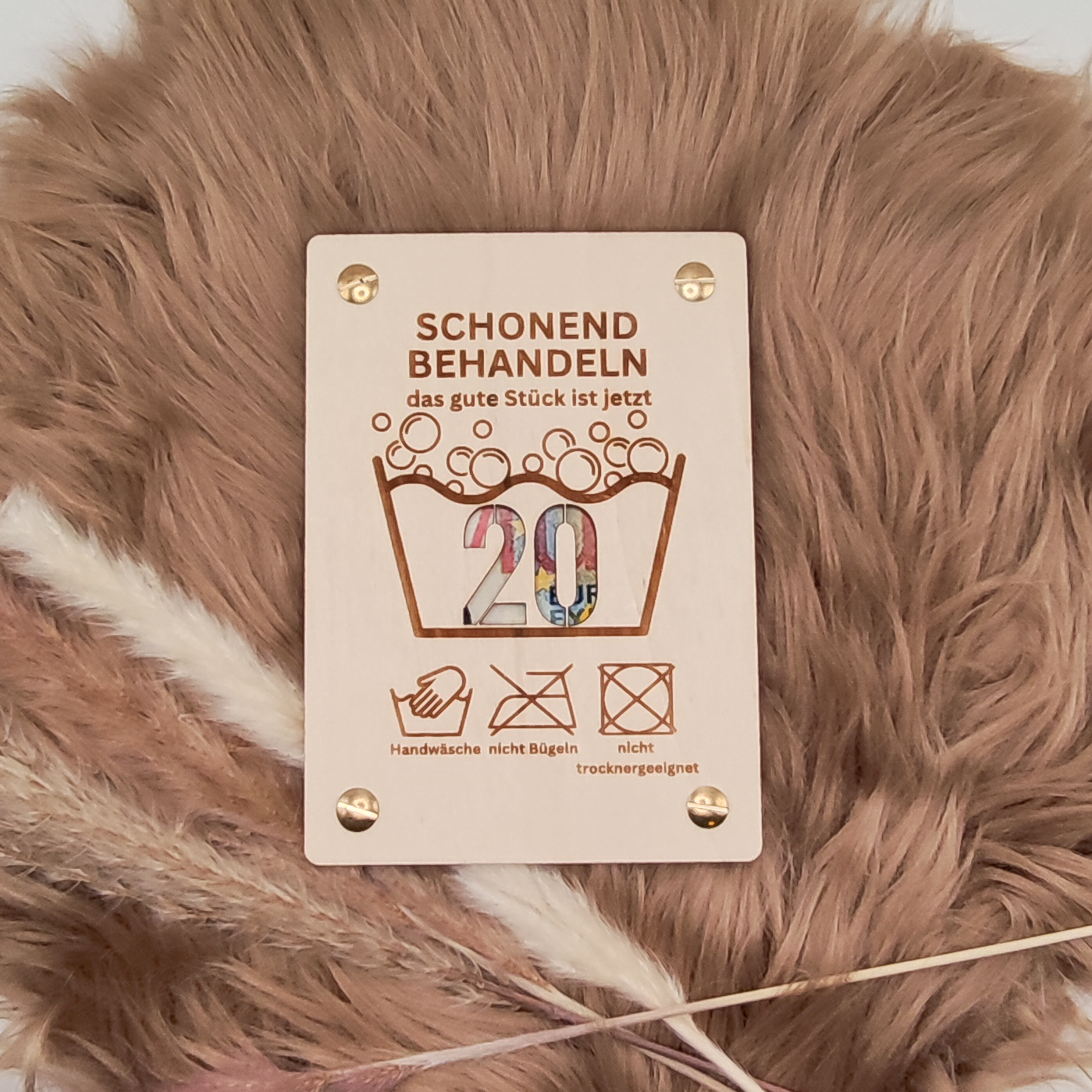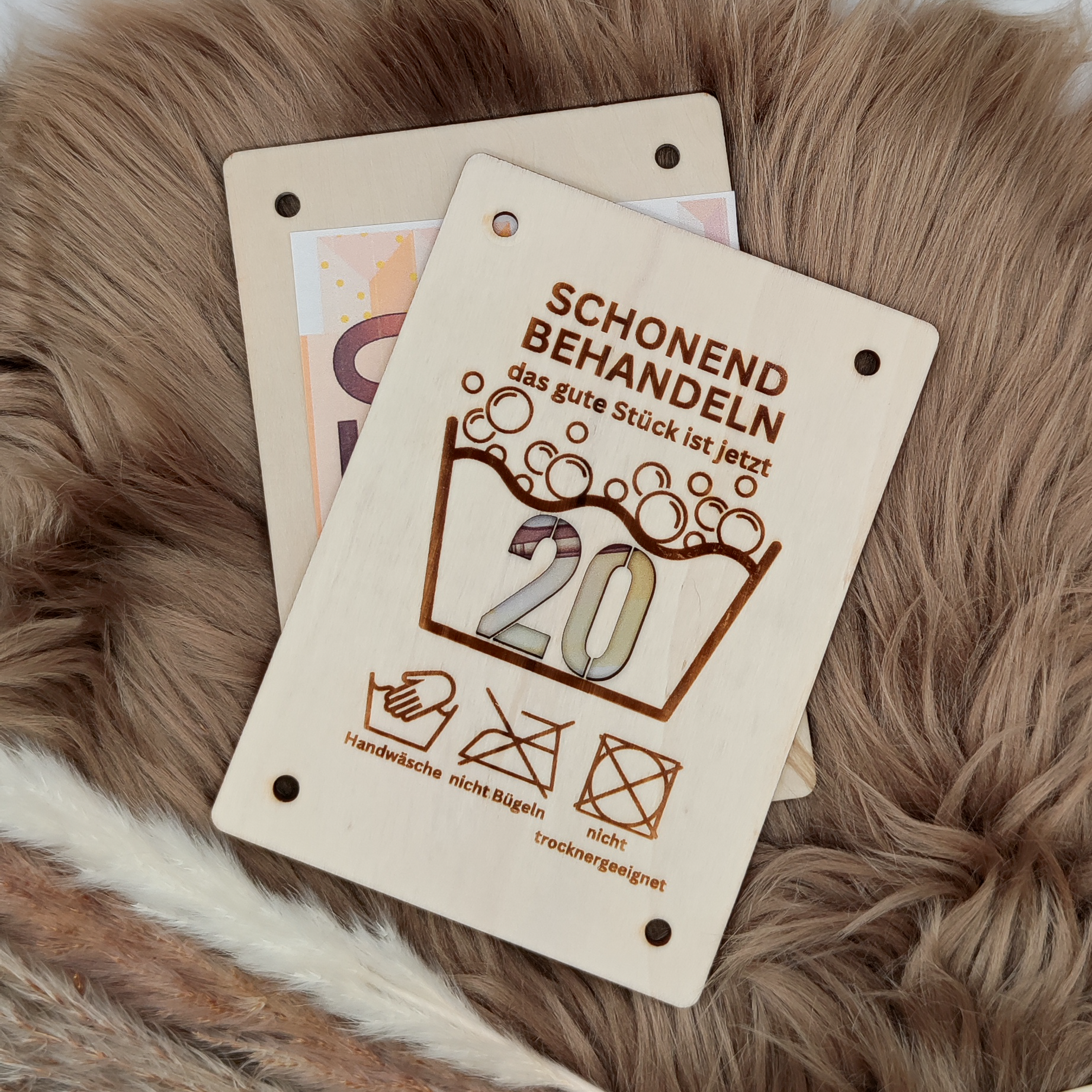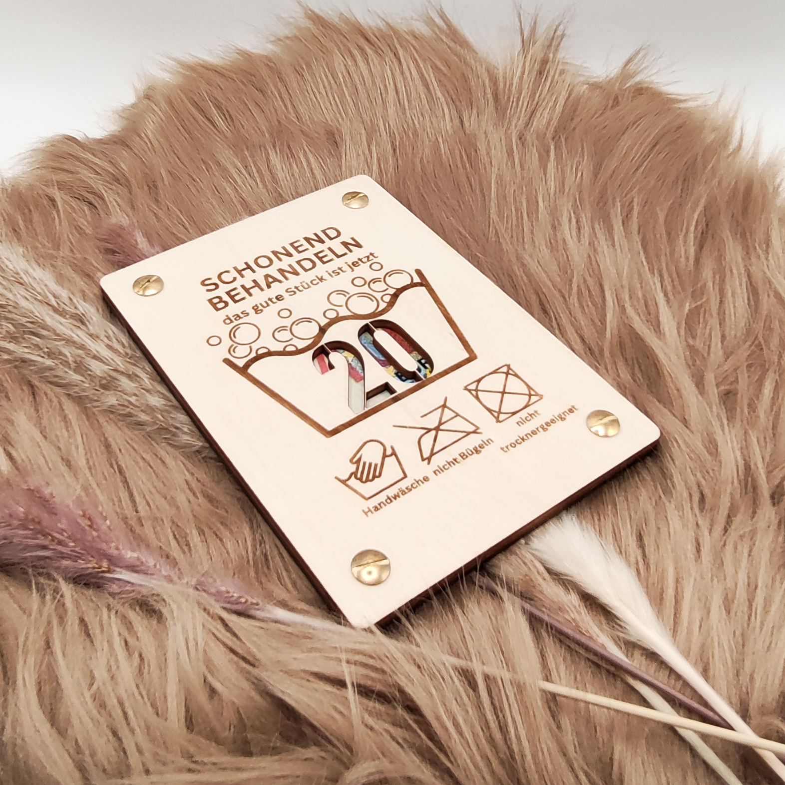 Schenke Humor und ein originelles Geldgeschenk mit dieser witzigen Holzkarte! Perfekt für Geburtstage, bei denen das Alter mit einem Augenzwinkern gefeiert wird. Die Karte ist mit dem humorvollen Spruch "Schonend Behandeln – das gute Stück ist jetzt..." graviert, wobei die Zahl des Alters als kreativer Ausschnitt präsentiert wird.