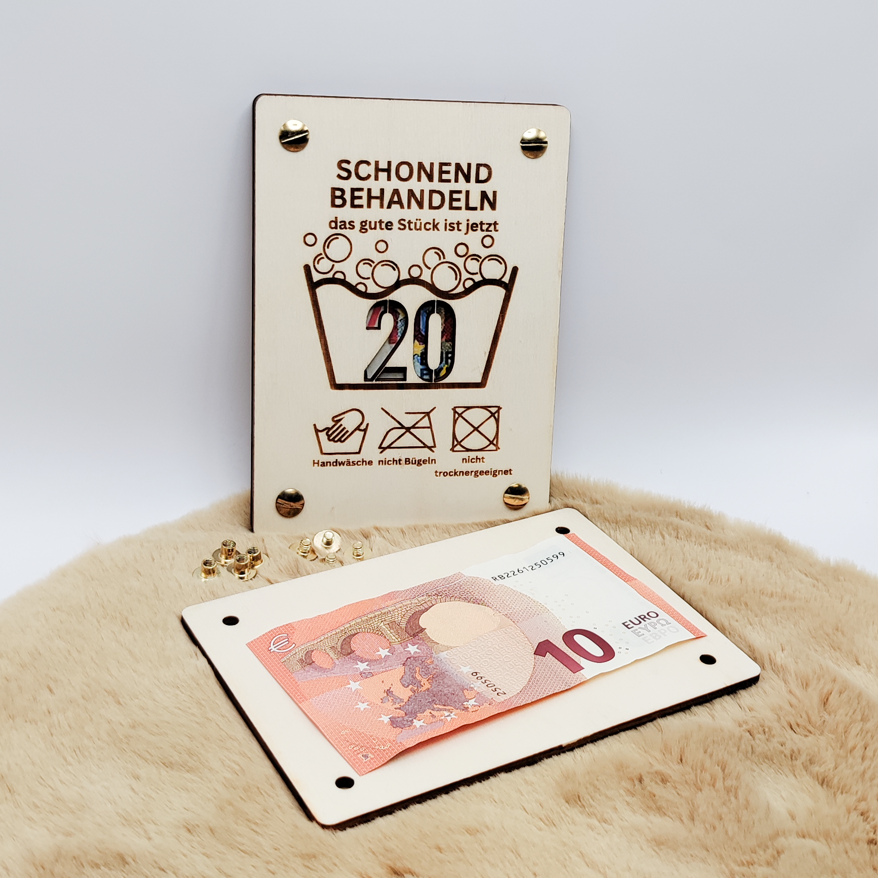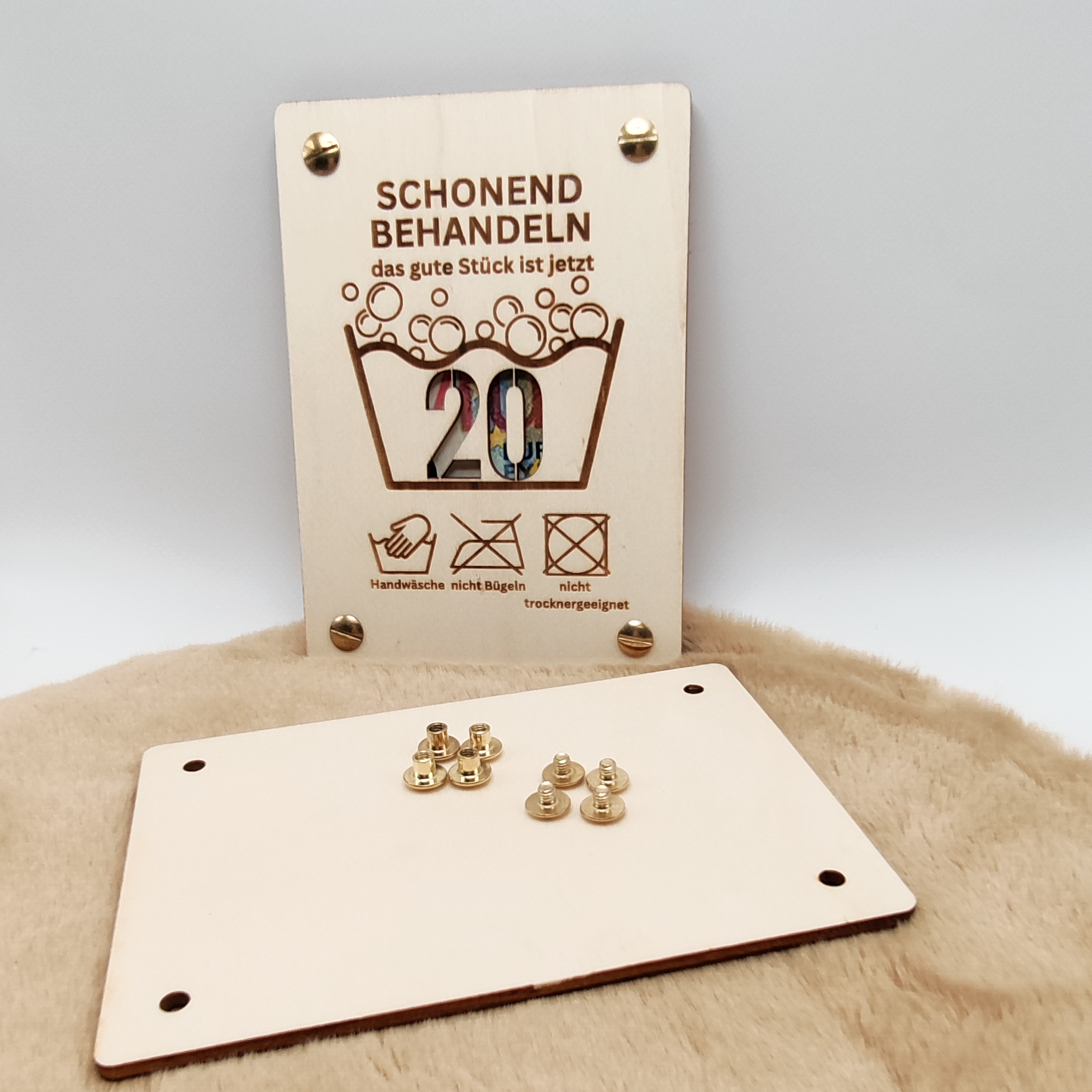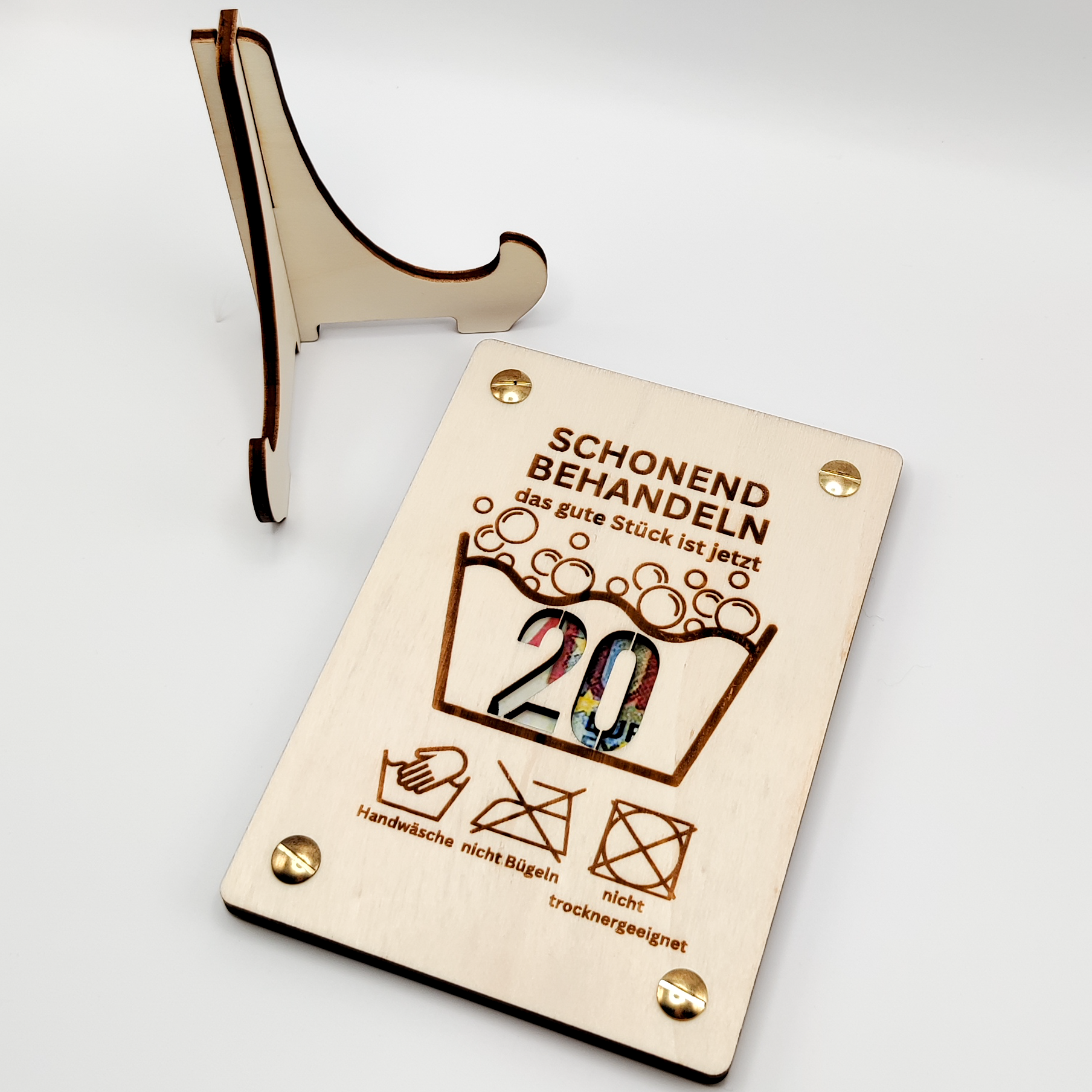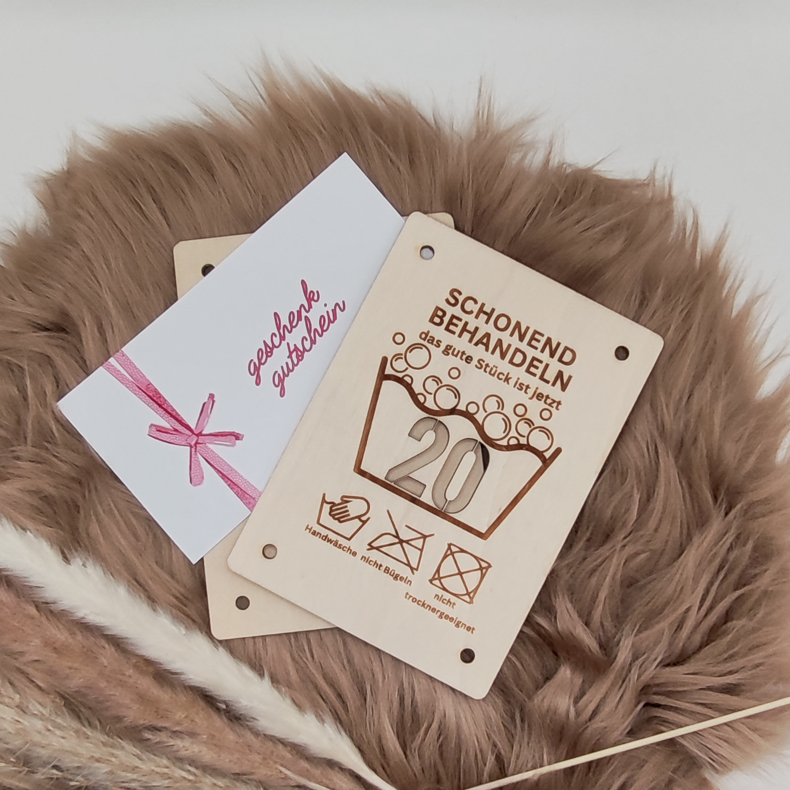 Schenke Humor und ein originelles Geldgeschenk mit dieser witzigen Holzkarte! Perfekt für Geburtstage, bei denen das Alter mit einem Augenzwinkern gefeiert wird. Die Karte ist mit dem humorvollen Spruch "Schonend Behandeln – das gute Stück ist jetzt..." graviert, wobei die Zahl des Alters als kreativer Ausschnitt präsentiert wird.