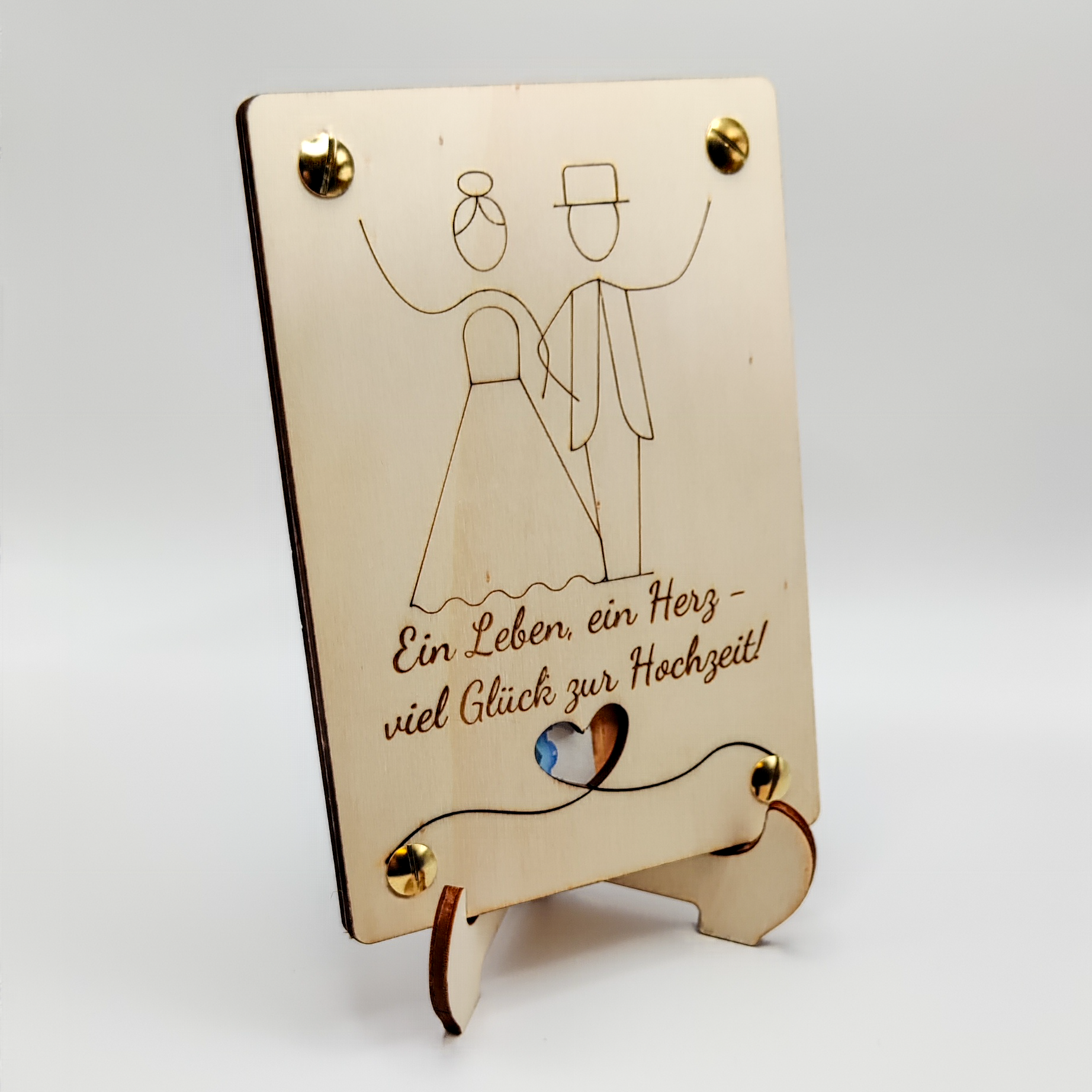 - Design: Lasergravur mit Brautpaar-Motiv und Herz-Ausschnitt