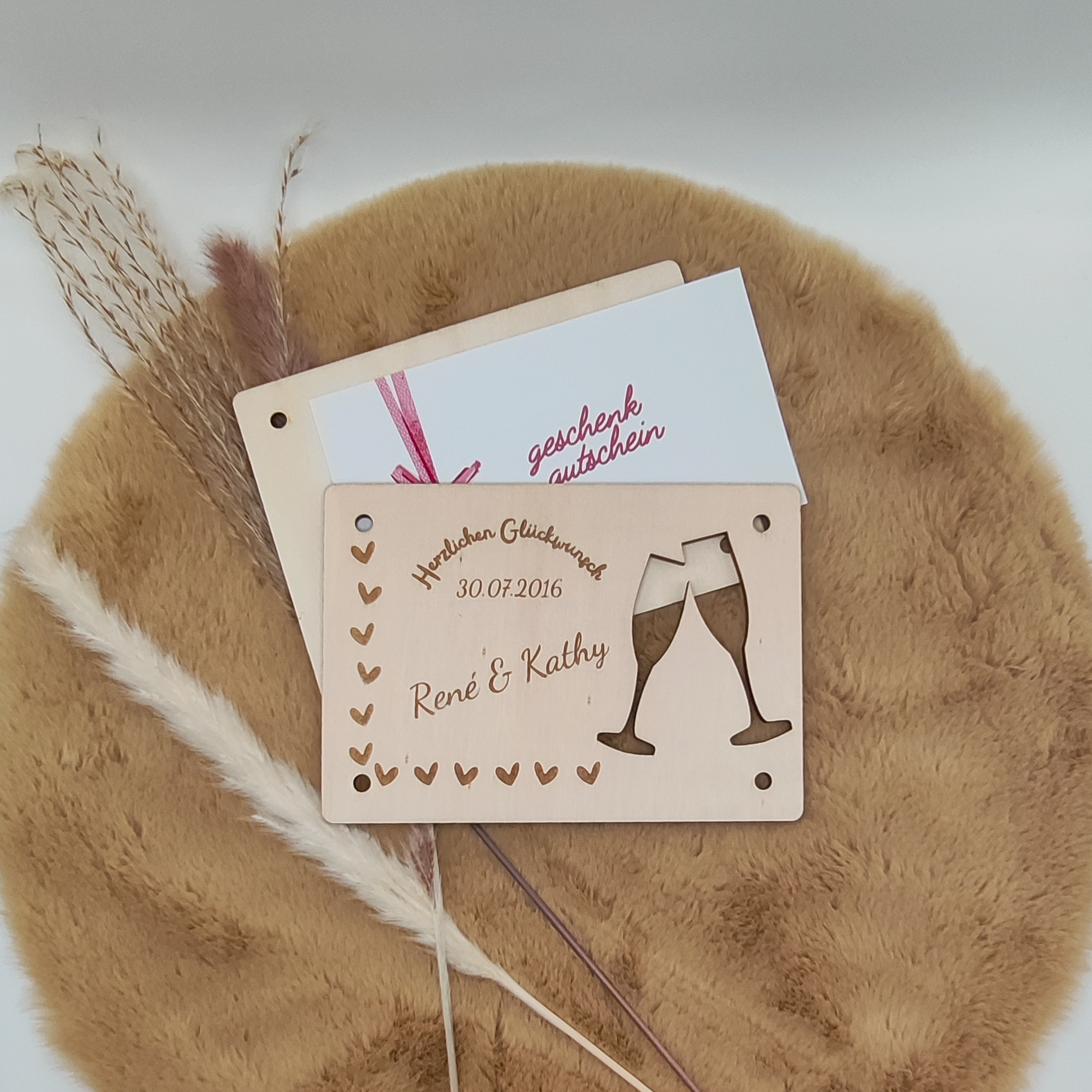 Mit dieser stilvollen Geldgeschenkkarte aus Holz wird das Überreichen von Geld oder Gutscheinen zur Hochzeit zu einem unvergesslichen Moment. Das edle Design mit zwei sich anstoßenden Sektgläsern, liebevollen Herzdetails und der Möglichkeit zur Personalisierung verleiht dieser Karte eine ganz besondere Note.