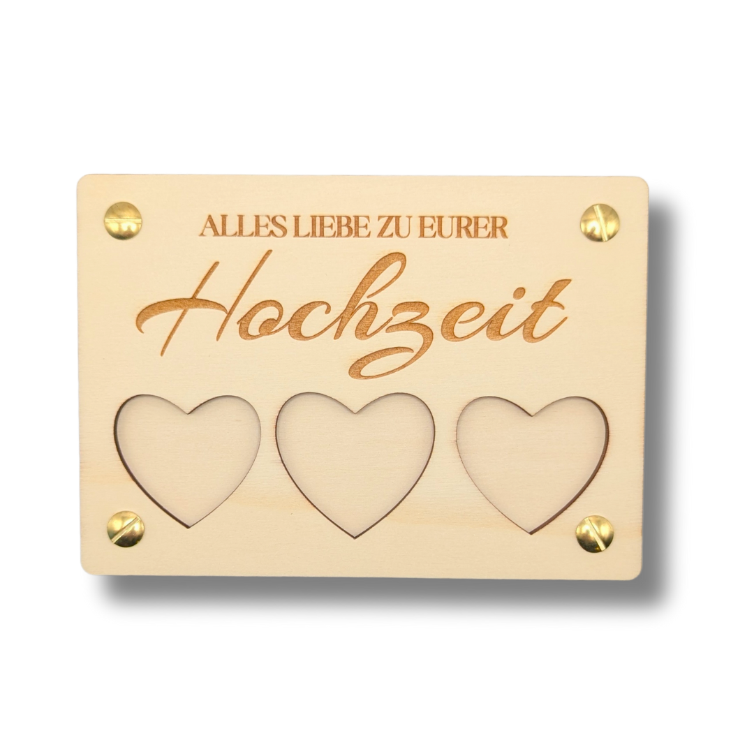 Zwischen den beiden Holzplatten lässt sich ganz einfach ein Geldschein oder ein Gutschein verstauen – ideal für alle, die ein stilvolles, langlebiges und persönliches Geschenk zur Hochzeit suchen. Ob für die beste Freundin, den Bruder oder das befreundete Paar – mit dieser Karte triffst du garantiert mitten ins Herz.