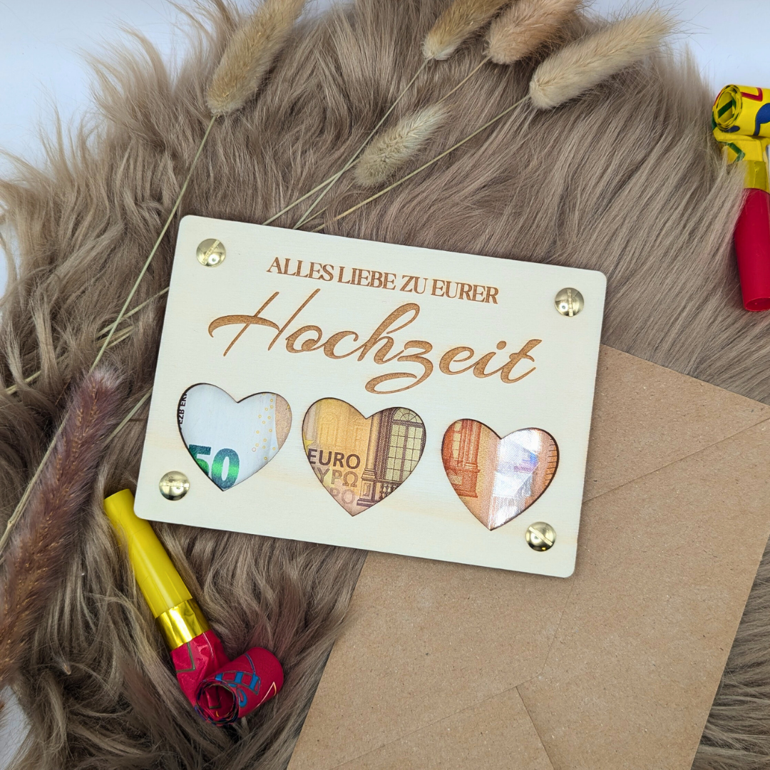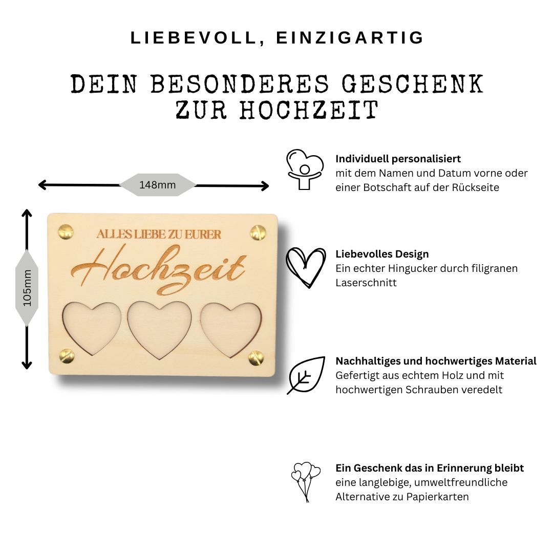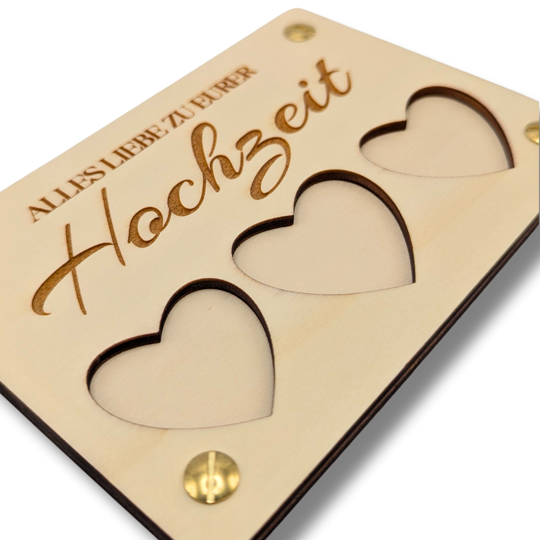 Personalisierte Hochzeitskarte aus Holz mit Herz-Design – Geldgeschenk oder Gutschein stilvoll verpackt – Geschenk zur Hochzeit