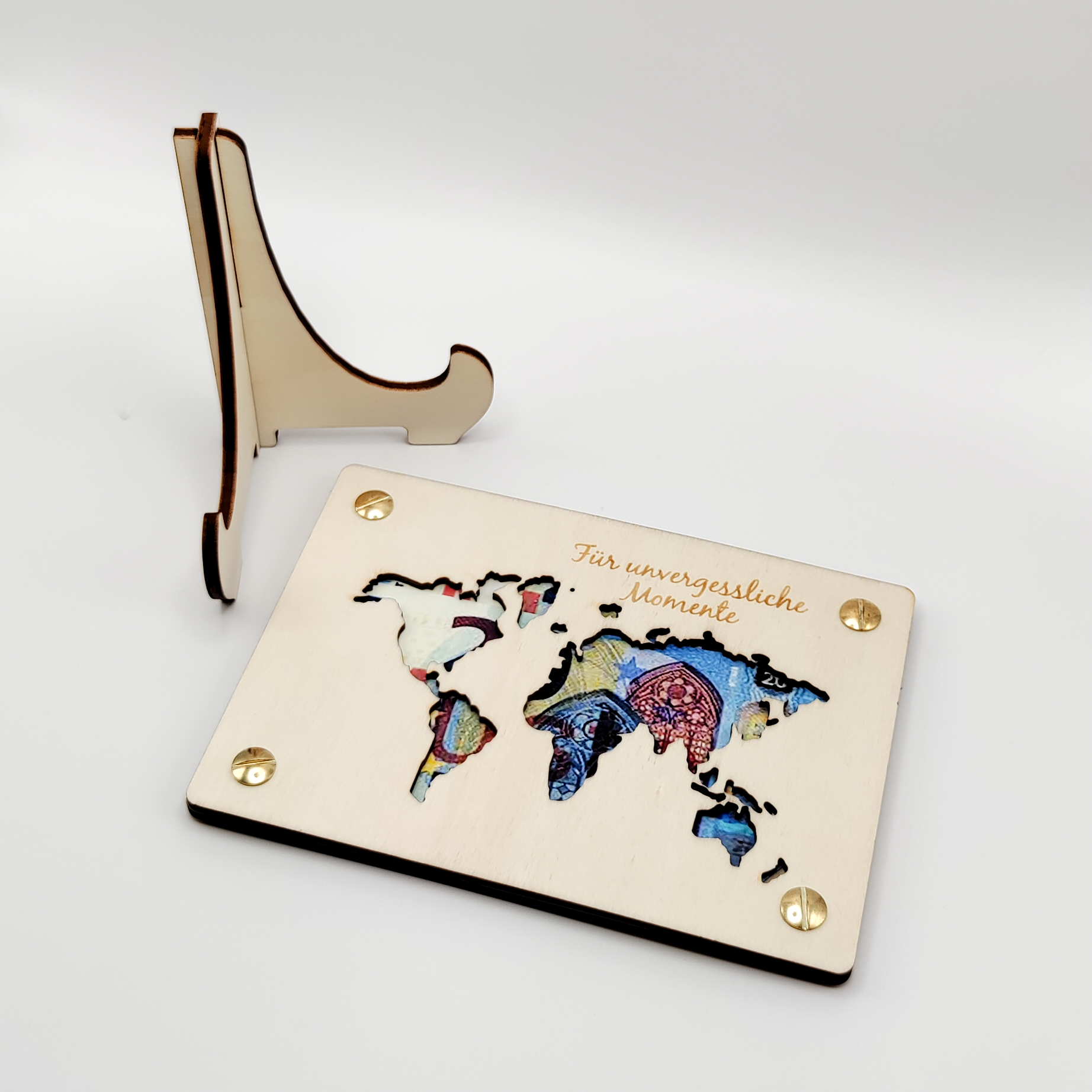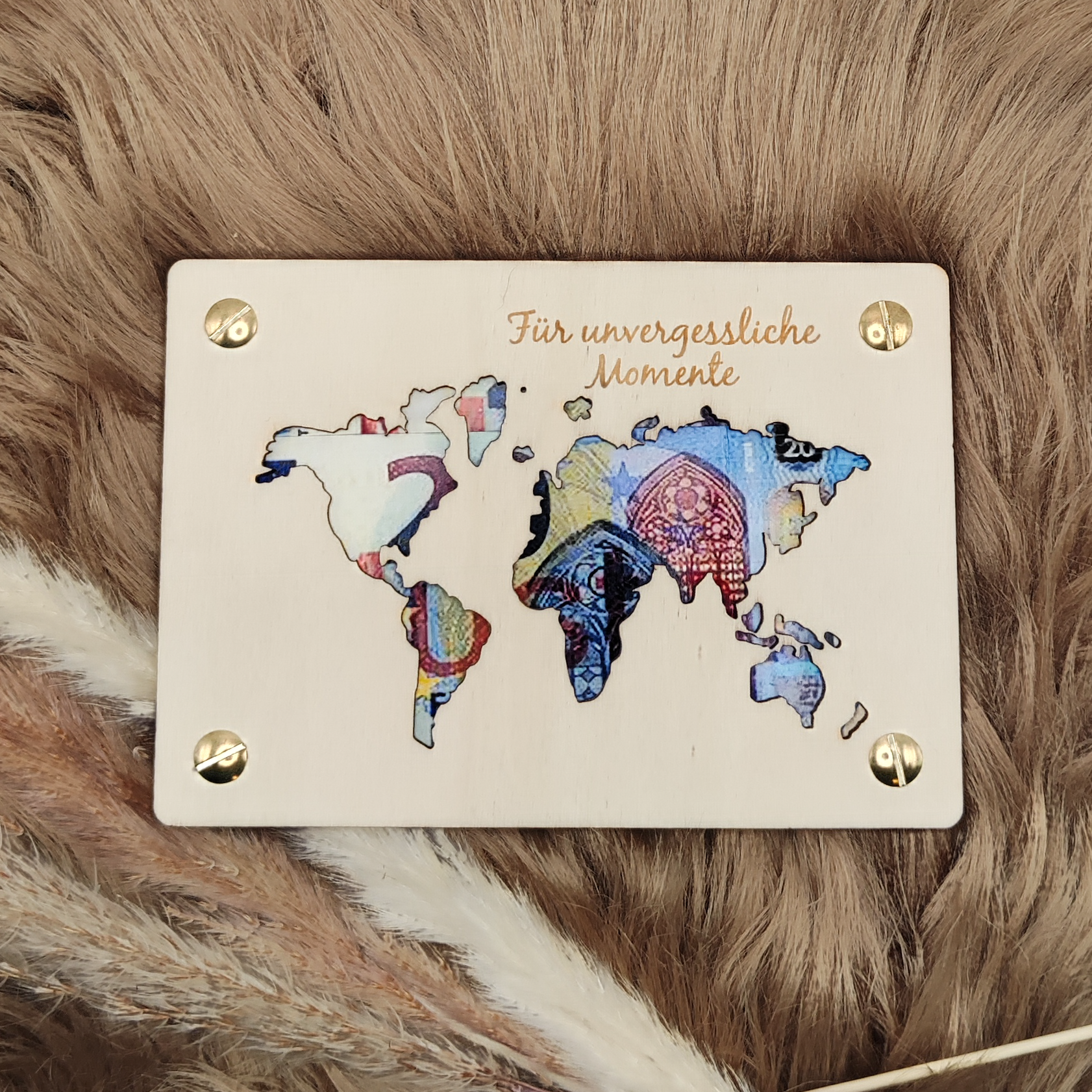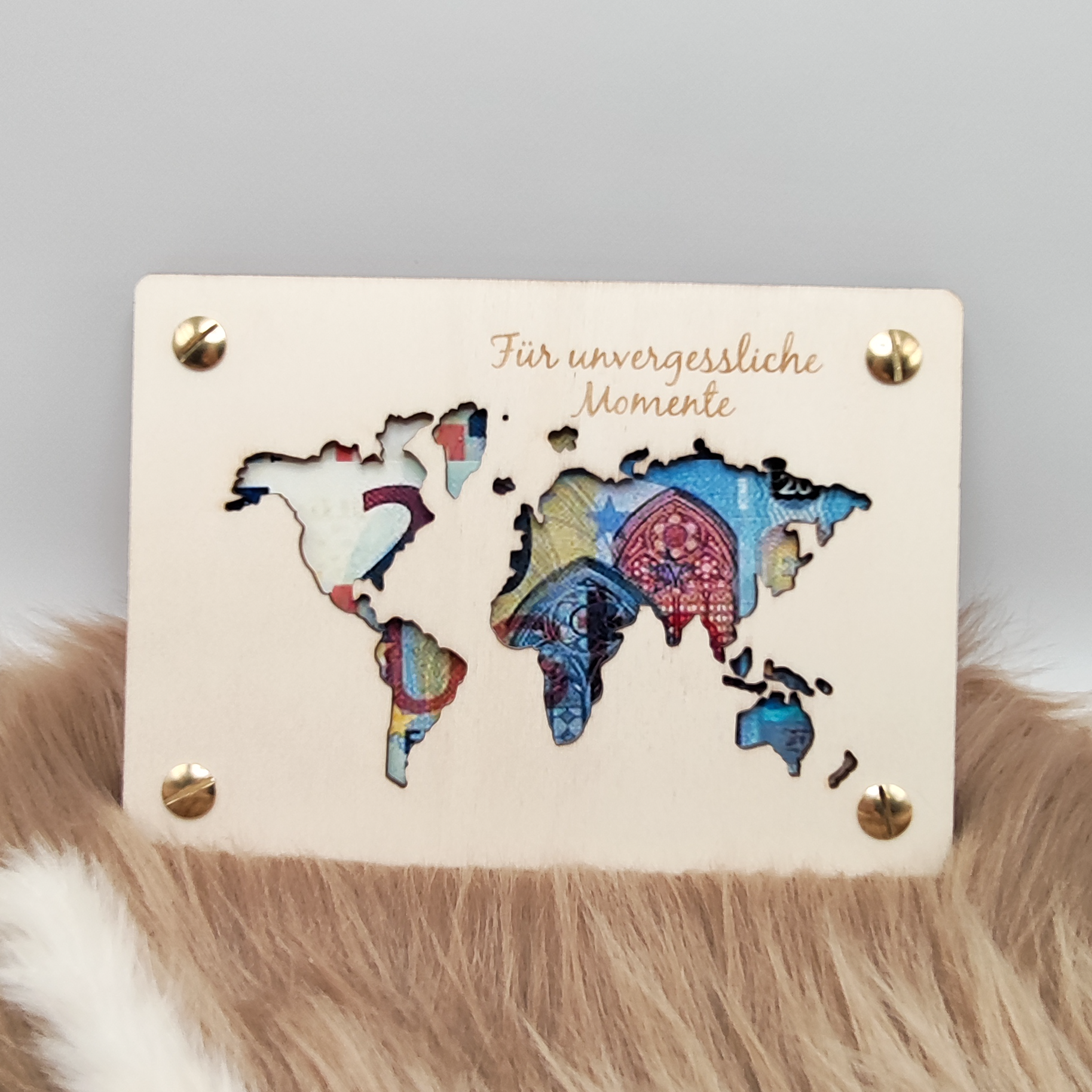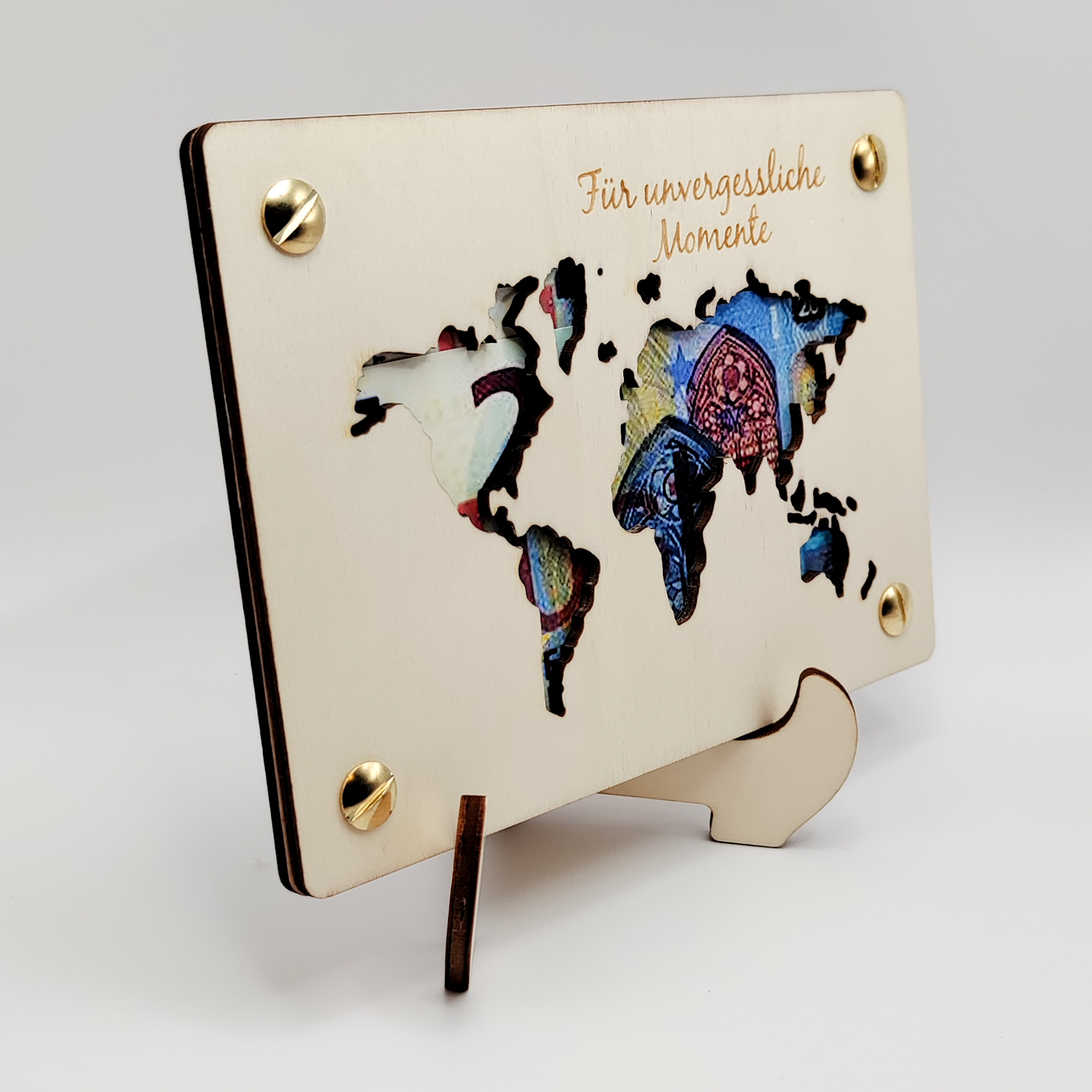 - Holzkarte mit Weltkarten-Ausschnitt und Gravur "Für unvergessliche Momente".