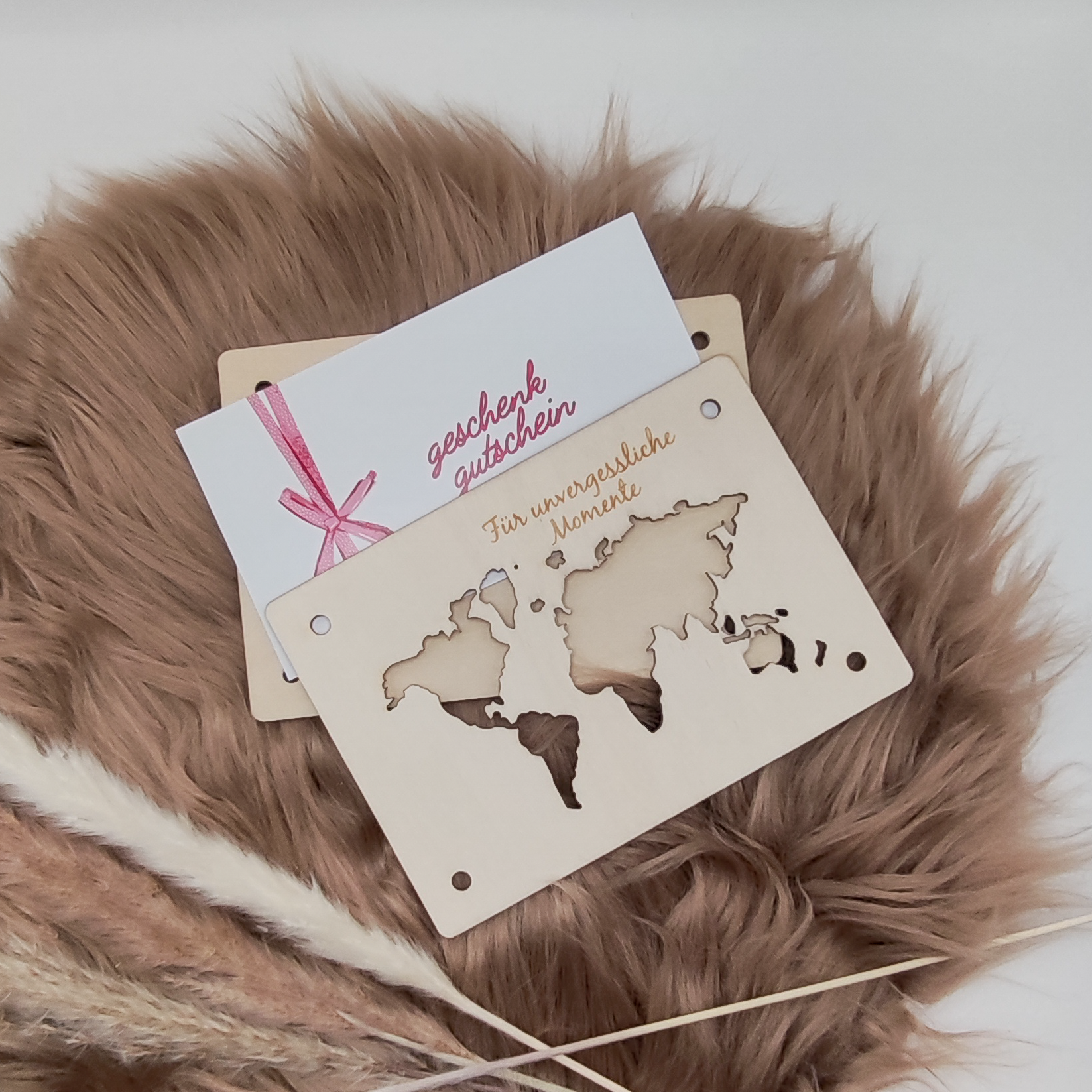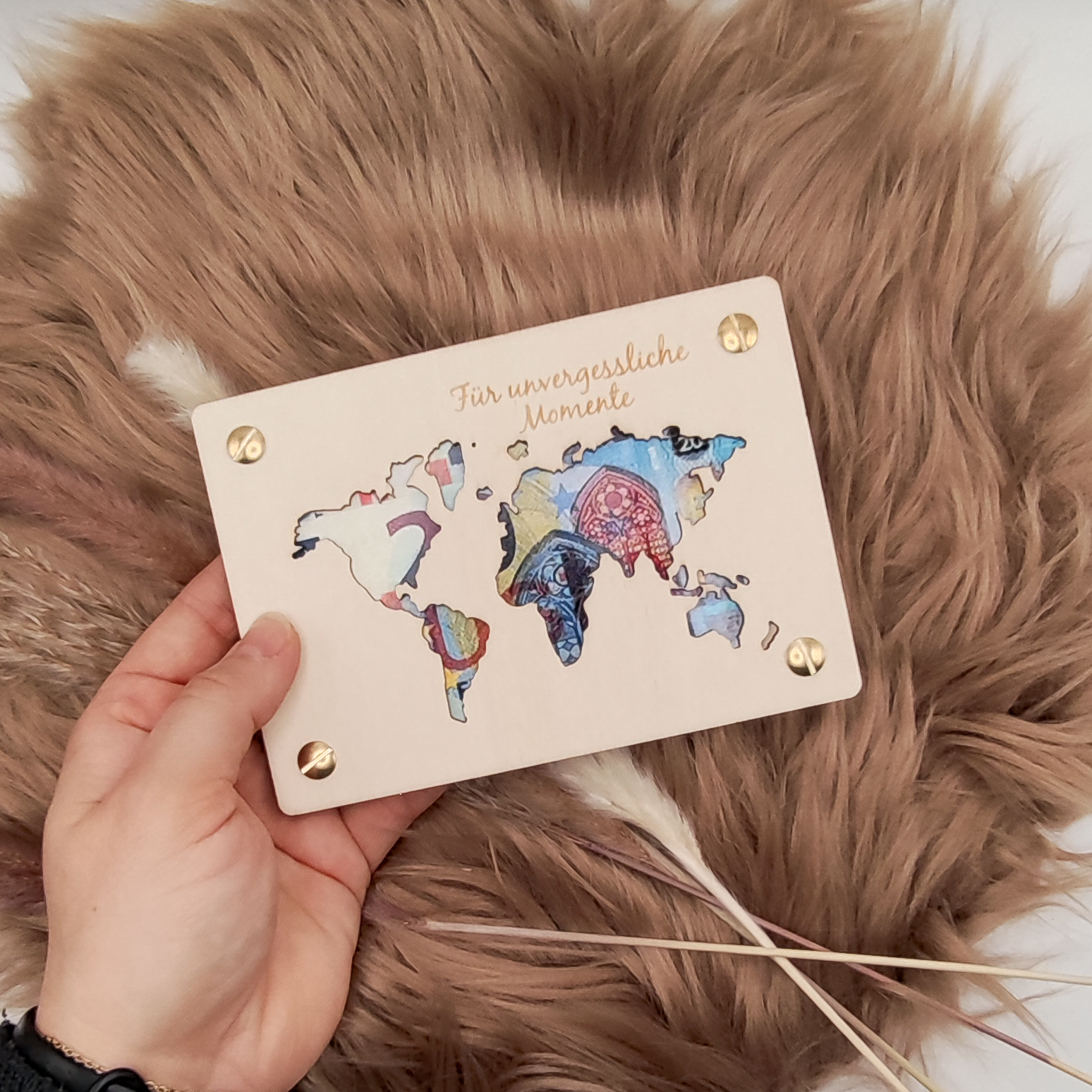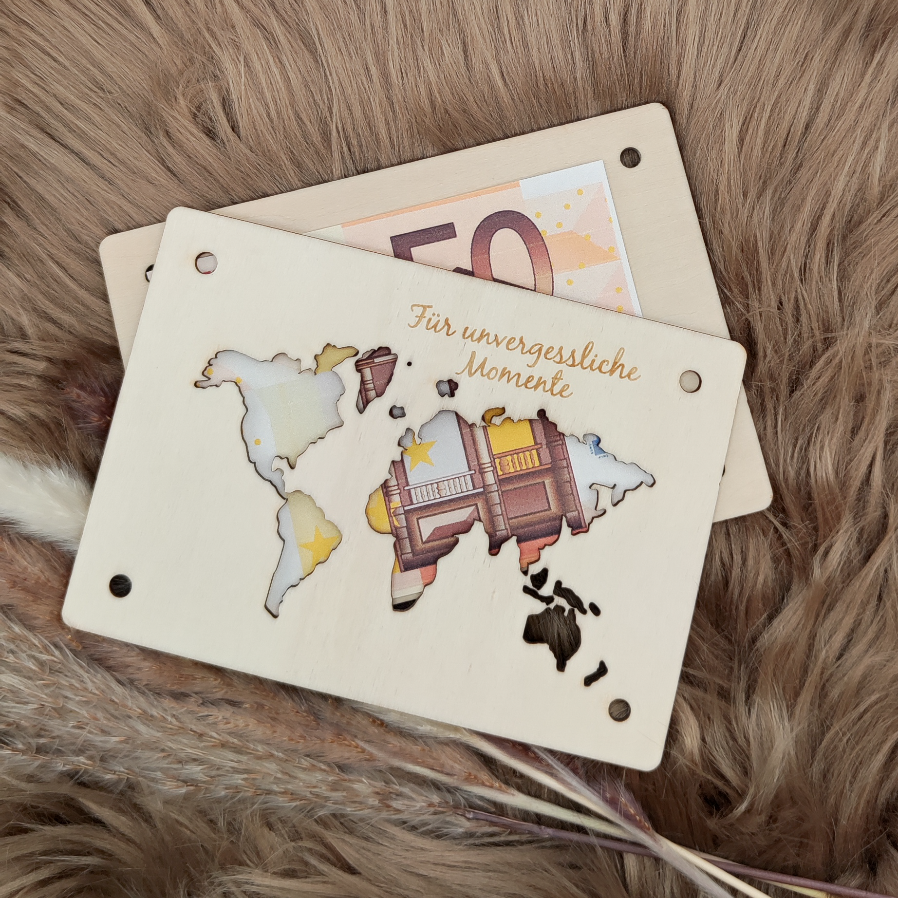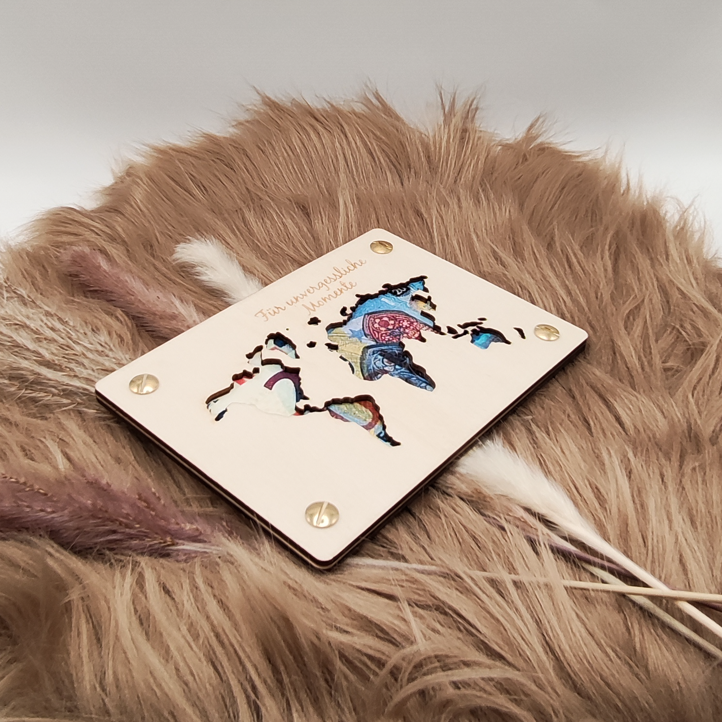 - Holzkarte mit Weltkarten-Ausschnitt und Gravur "Für unvergessliche Momente".