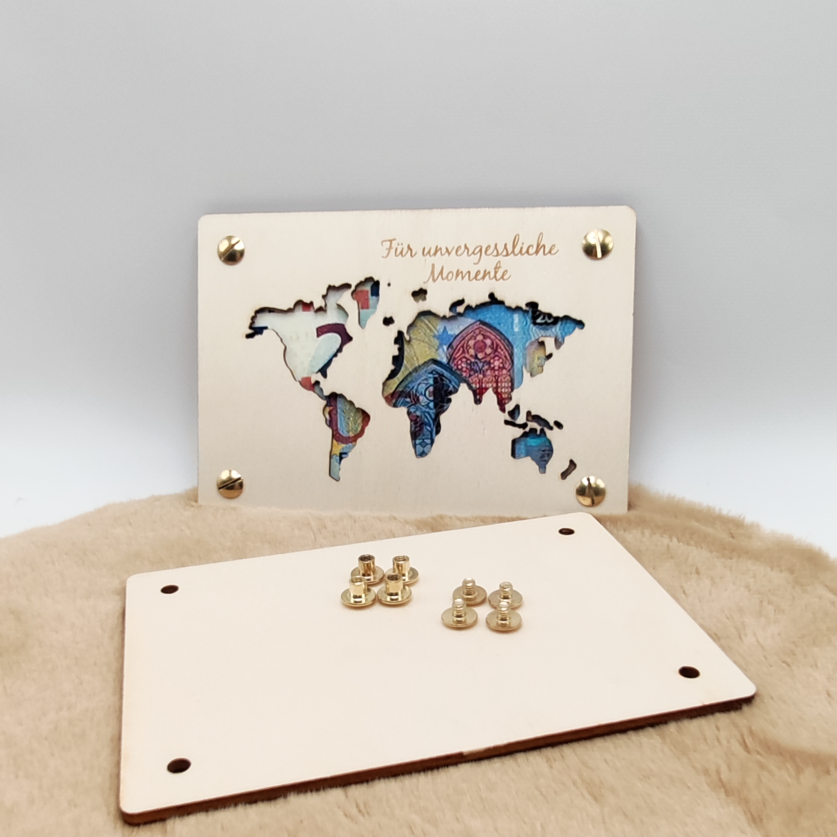 - Individuelles Design: Die filigran ausgeschnittene Weltkarte symbolisiert die Vielfalt der Abenteuer, die vor dem Beschenkten liegen.