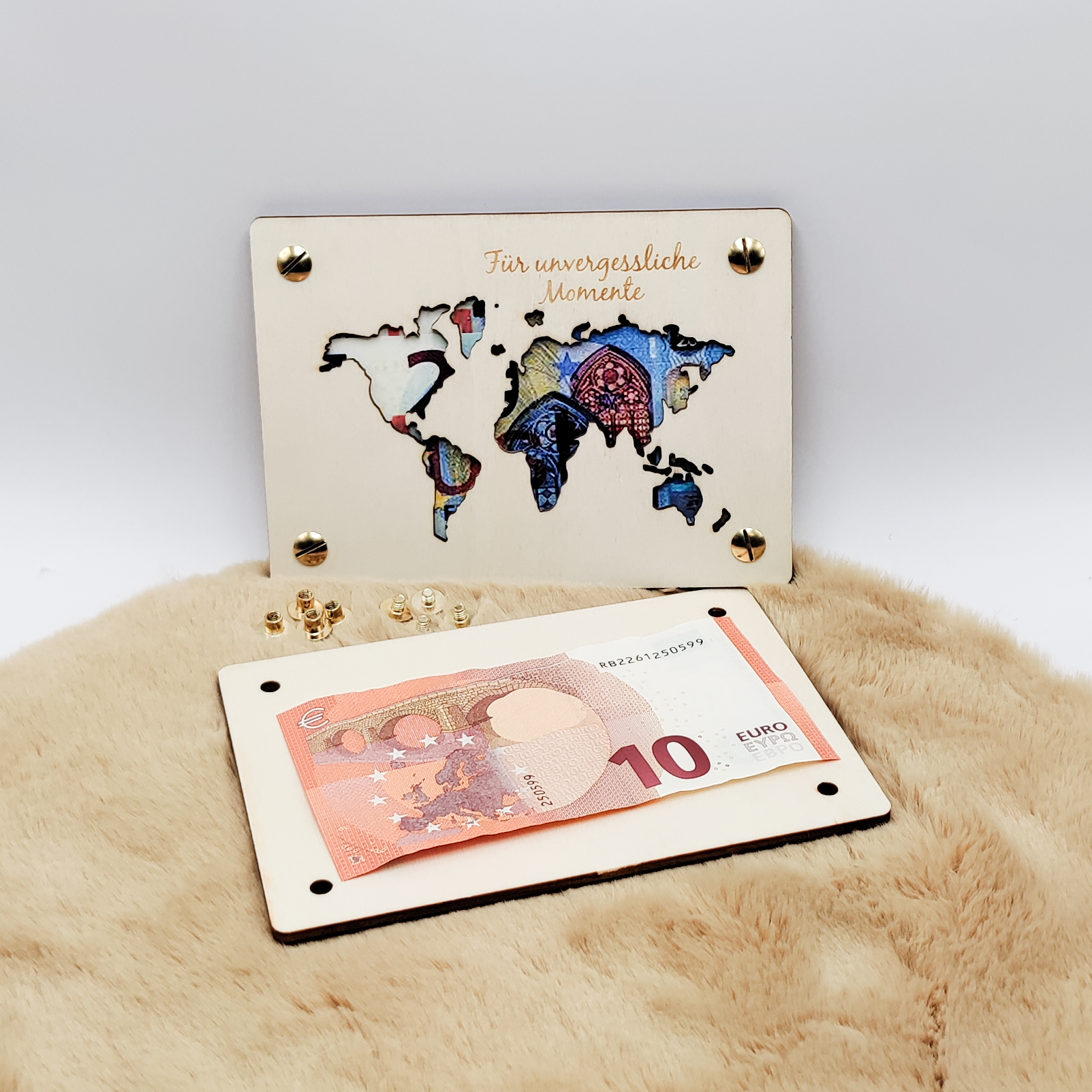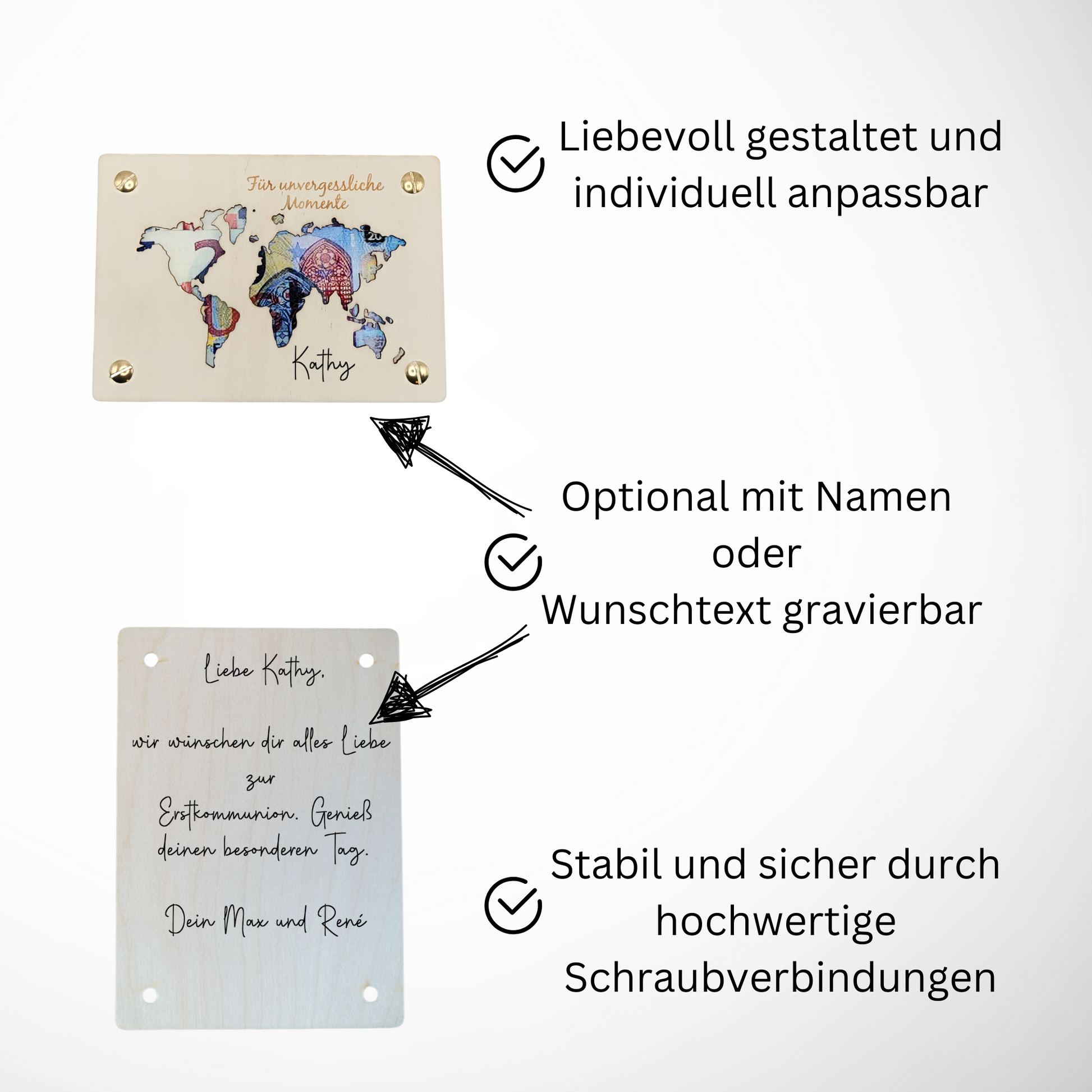 - Inklusive Rückseite: Die Karte wird mit einer abnehmbaren Rückseite geliefert, die mit Schrauben befestigt ist – ideal zur sicheren Aufbewahrung von Geldscheinen oder Gutscheinen.