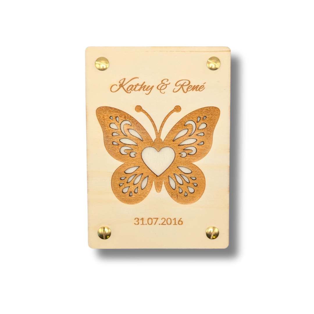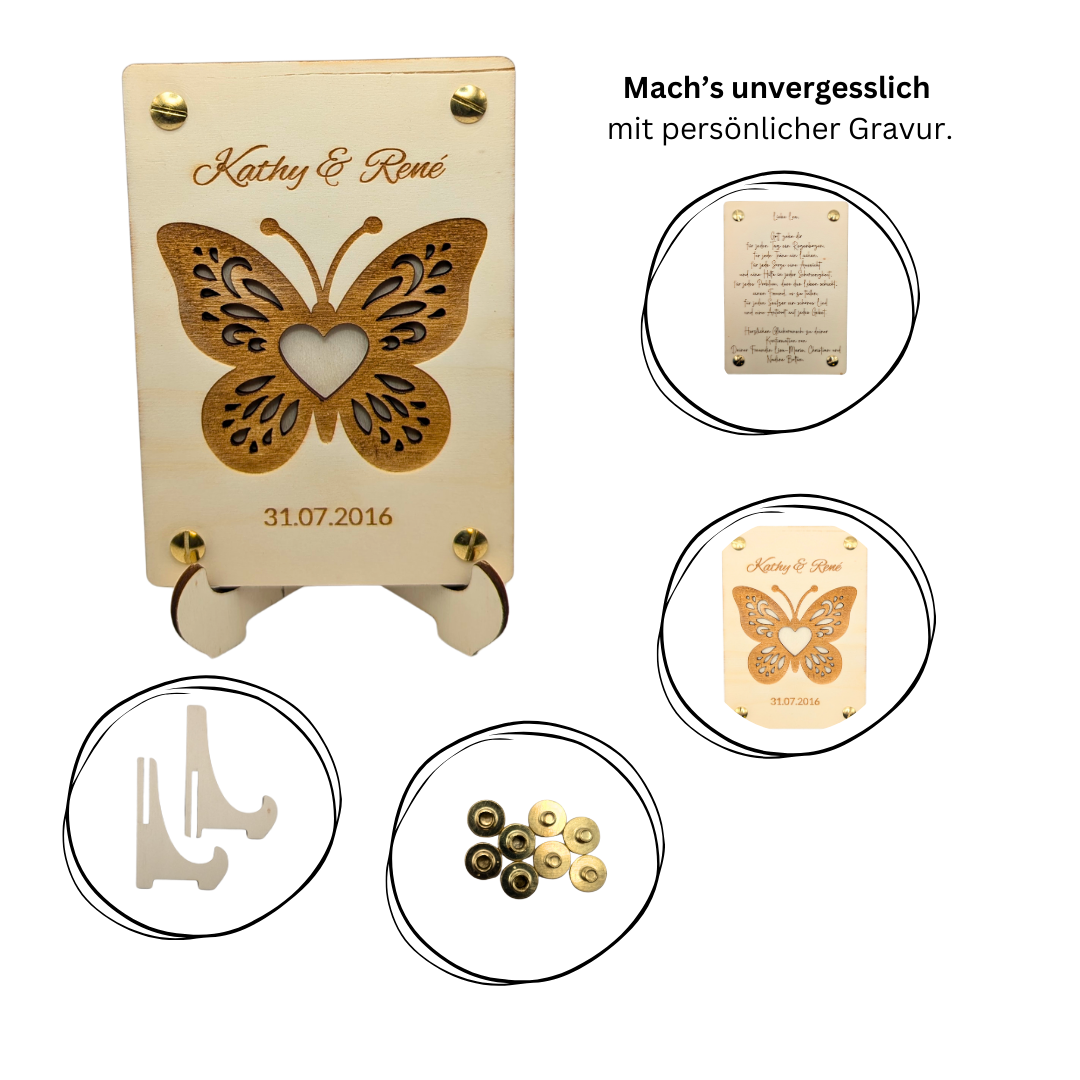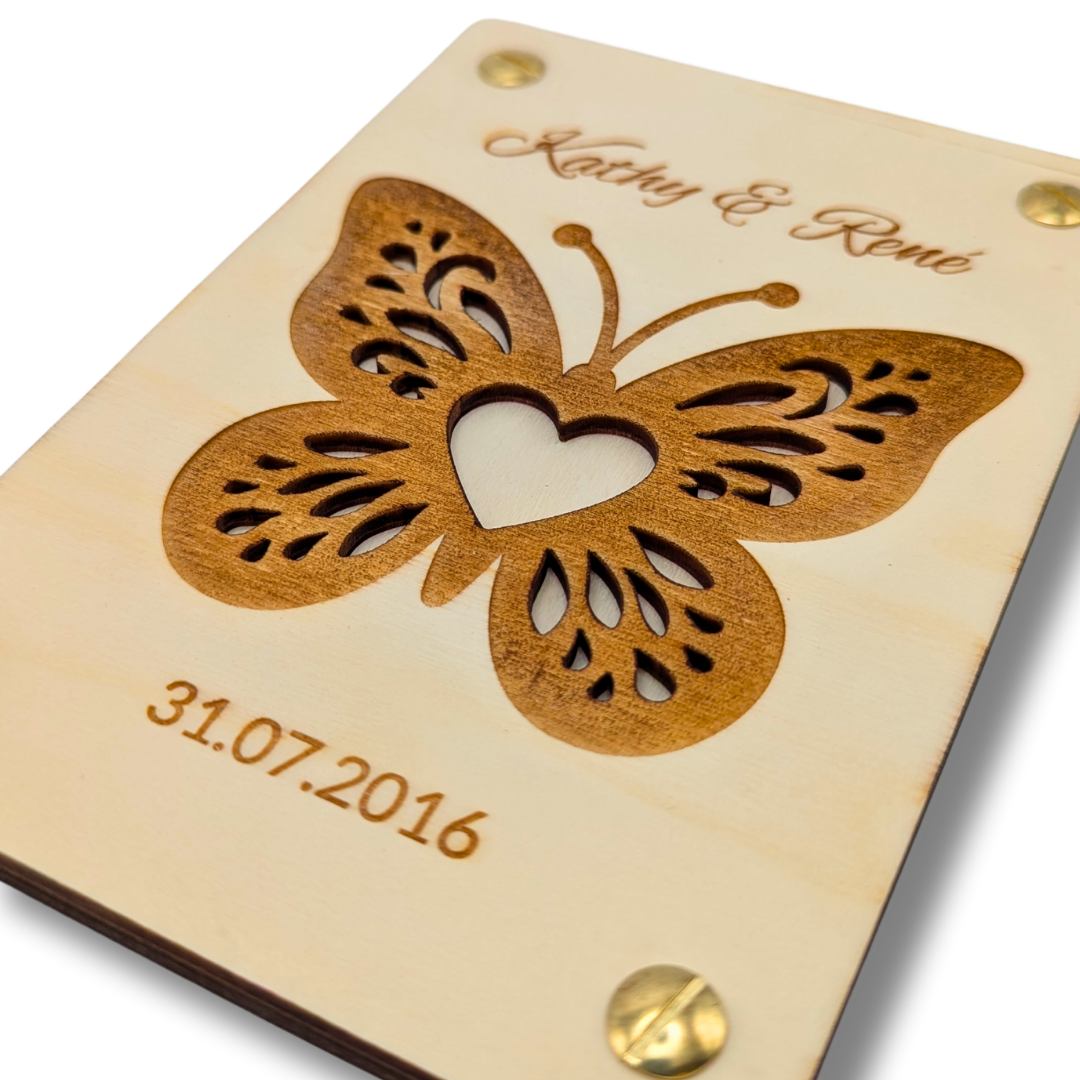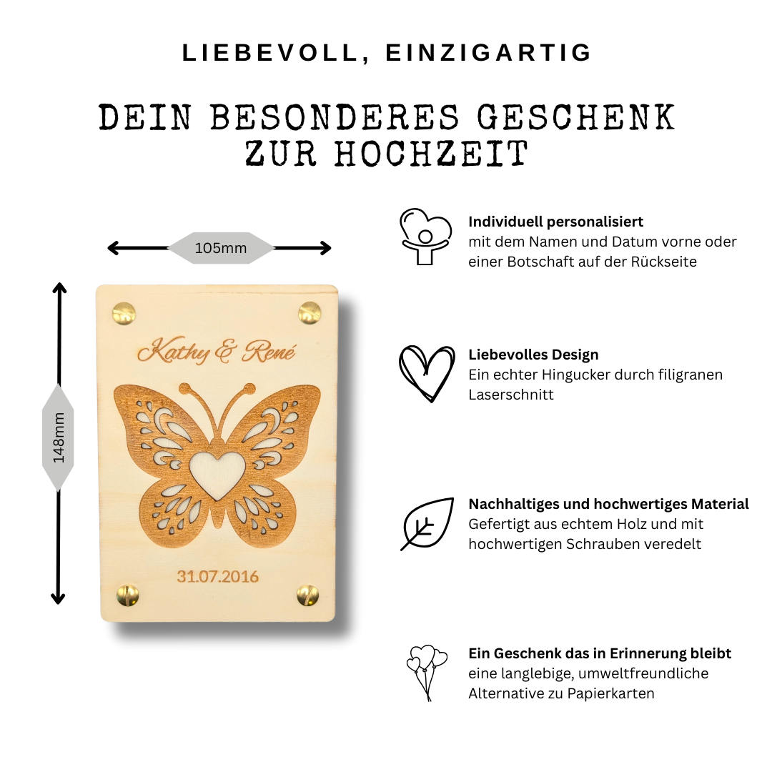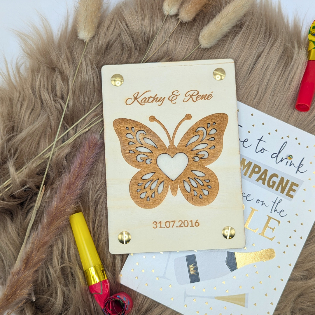 Personalisierte Holzkarte mit Schmetterling mit Herz – Gravur von Namen & Datum – Geschenk zur Hochzeit, Jahrestag, Valentinstag