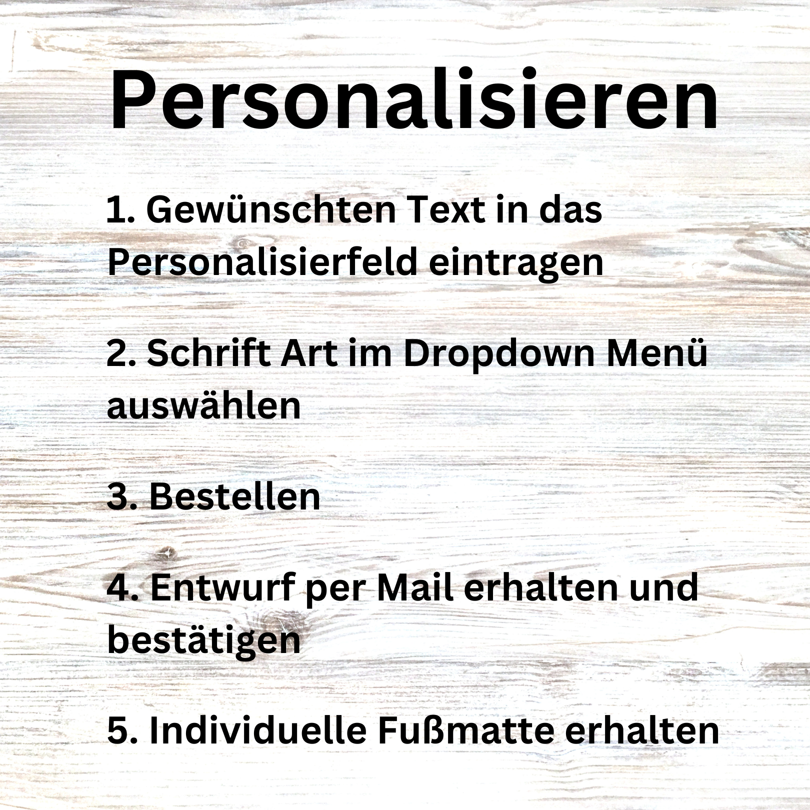 Mit deinem ganz persönlichen Spruch, Namen oder Statement wird aus einer schlichten Fußmatte ein echtes Highlight. Einfach Wunschtext eingeben, Lieblings-Schriftart auswählen und deine maßgeschneiderte Matte erhalten. Du bekommst vorab einen Entwurf zur Freigabe – so bist du immer auf der sicheren Seite.