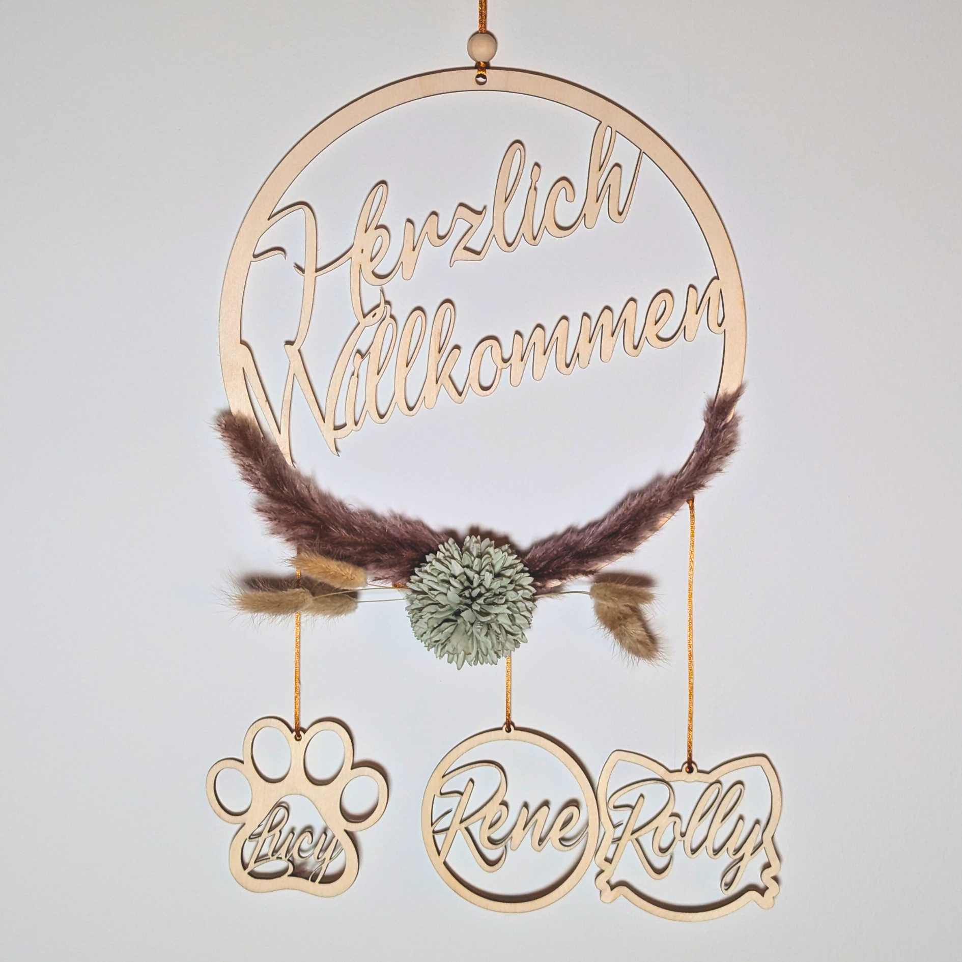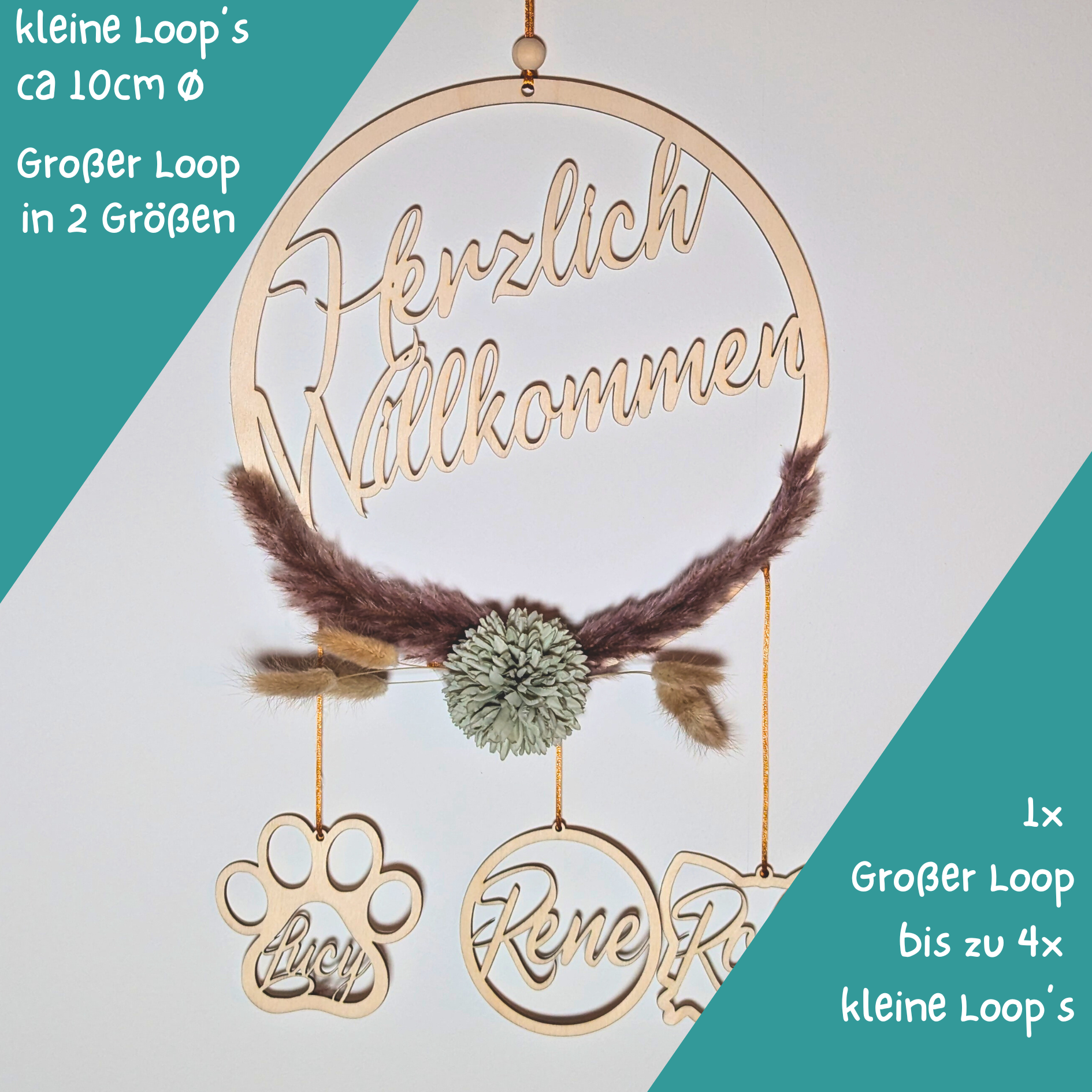 Gestalte deinen Eingangsbereich mit unserem liebevoll gefertigten Willkommens-Loop, der nicht nur deinen Gästen ein herzliches Willkommen schenkt, sondern auch perfekt auf dich und deine Familie abgestimmt ist. Ob für Menschen oder tierische Mitbewohner – mit den kleinen Loops kannst du das Design individuell anpassen.